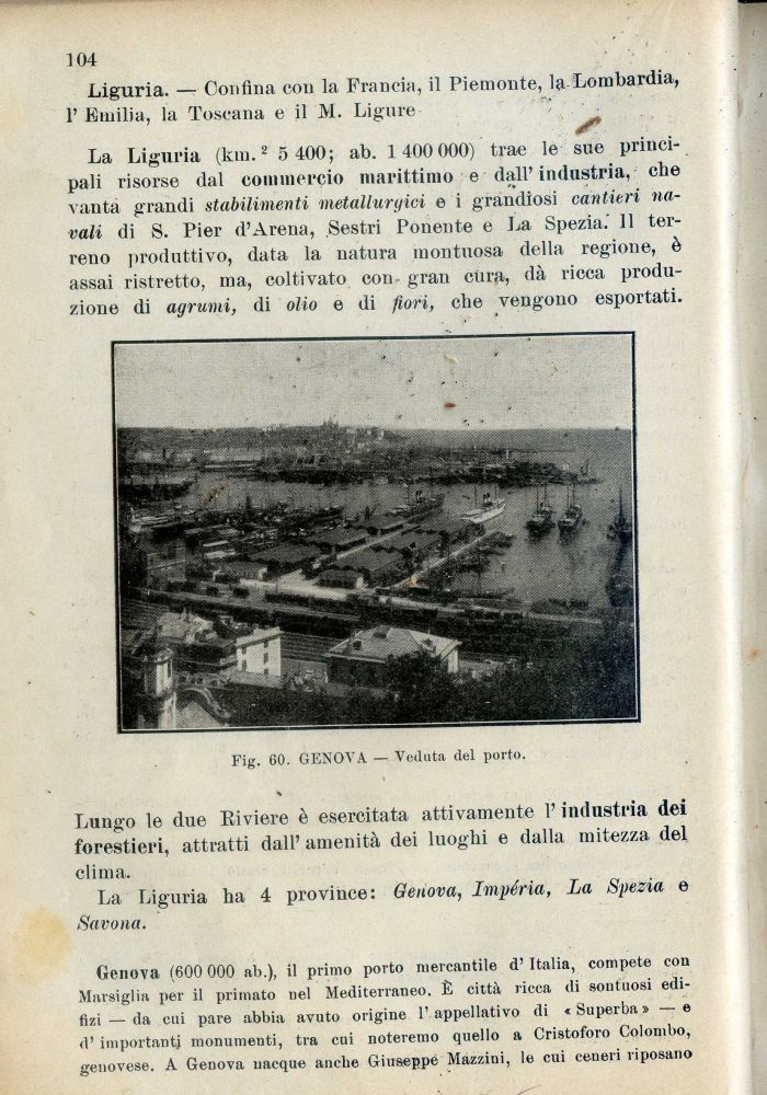Genova (600 000 ab.), il primo porto mercantile d' Italia, compete con Marsiglia per il primato nel Mediterraneo. È città ricca di sontuosi edi-fizi— da cui pare abbia avuto origine 1' appellativo di «Superba» —e d' importanti monumenti, tra cui noteremo quello a Cristoforo Colombo, genovese. A Genova nacque anche Giuseppe Mazzini, le cui ceneri riposano