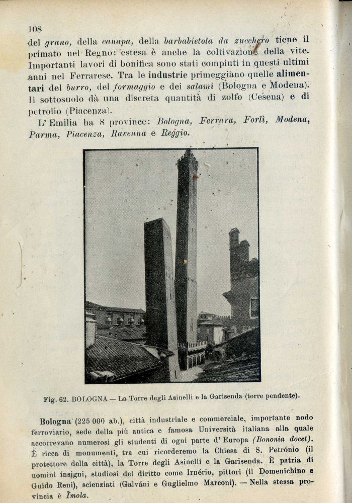 Bologna (225 000 ab.), città industriale e commerciale, importante nodo ferroviario, sede della più antica e famosa Università italiana alla quale accorrevano numerosi gli studenti di ogni parte d' Europa (Bononia docet). È ricca di monumenti, tra cui ricorderemo la Chiesa di S. Petrónio (il protettore della città), la Torre degli Asinelli e la Garisenda. È patria di uomini insigni, studiosi del diritto come Irnério, pittori (il Domenichino e Guido Reni), scienziati (Galvàni e Guglielmo Marconi). — Nella stessa provincia è tmola.