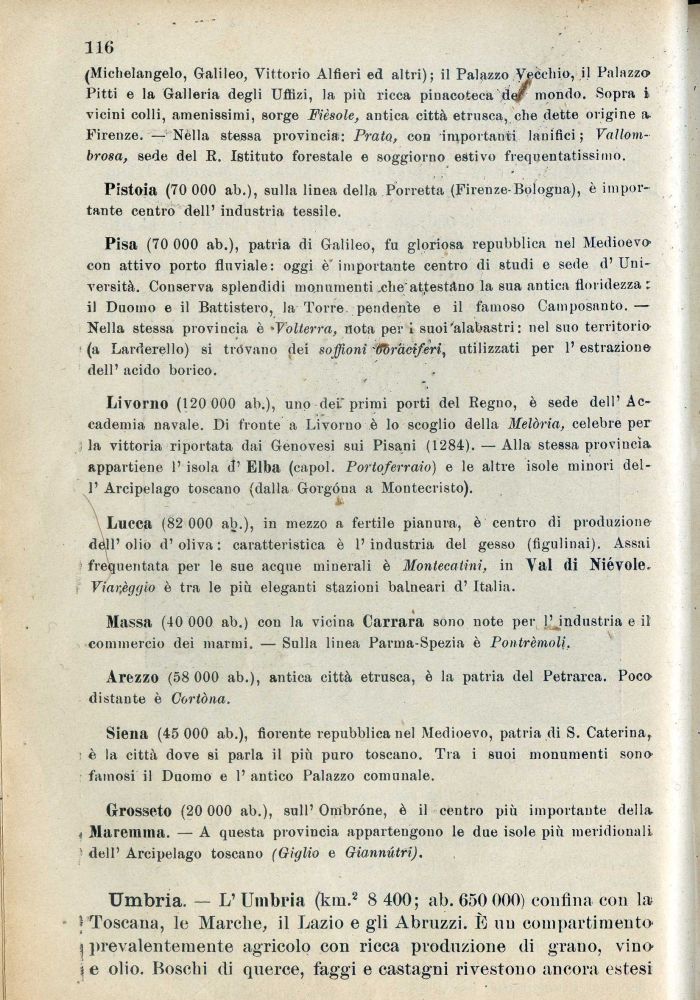 Pisa (70 000 ab.), patria di Galileo, fu gloriosa repubblica nel Medioevo con attivo porto fluviale: oggi è'importante centro di studi e sede d'Università. Conserva splendidi monumenti .che'attestano la sua antica floridezza : il Duomo e il Battistero, la Torre pendente e il famoso Camposanto. — Nella stessa provincia è 'Volterra, nota per i suoi'alabastri : nel suo territorio (a Larderello) si trdvano dei soffioni -(fbracifèri, utilizzati per 1' estrazione dell' acido borico.