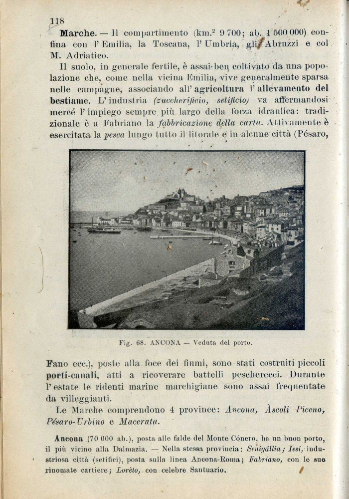 Ancona (70 000 ab.), posta alle falde del Monte Conerò, ha un buon porto, il più vicino alla Dalmazia. —Nella stessa provincia : Senigallia; Iesi,-industriosa, città (setifici), posta sulla linea Ancona-Roma; Fabriano, con le suo rinomate cartiere; Loreto, con celebre Santuario. f