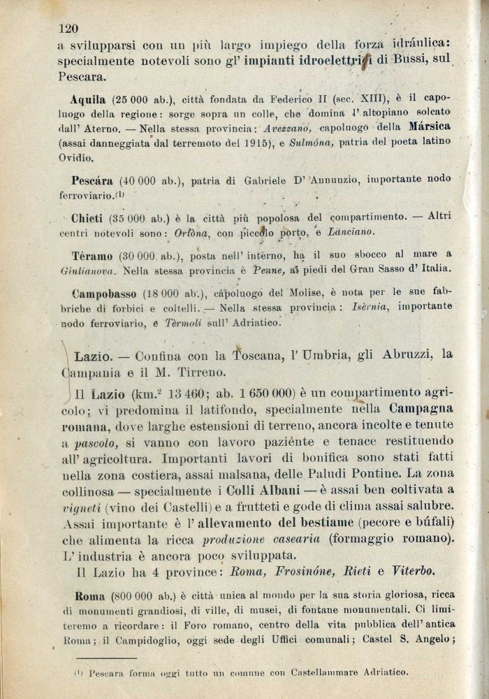 Roma (800 000 ab.) è città unica al mondo per la sua storia gloriosa, ricca di monumenti grandiosi, di ville, di musei, di fontane monumentali. Ci limiteremo a ricordare: il Poro romano, centro della vita pubblica dell'antica lioina ; il Campidoglio, oggi sede degli Uffici comunali; Castel S. Angelo;