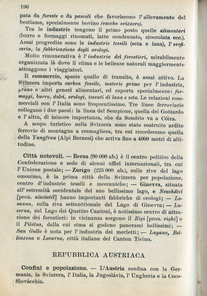 Città notevoli. — Berna (90 000 ab.) è il centro politico della Confederazione e sede di alcuni uffici internazionali, tra cui l'Unione postale; — Zurigo (225 000 ab.), sulle rive del lago omonimo, è la prima città della Svizzera per popolazione, centro d'industrie tessili e meccaniche; — Ginevra, situata all' estremità occidentale del suo bellissimo lago, e Neuchàtel [pron. nèsciatél] hanno importanti fabbriche di orologi; — Losanna, sulla riva settentrionale del Lago di Ginevra; — Lucerna, sul Lago dei Quattro Cantoni, è notissimo centro di attrazione dei forestieri: in vicinanza sorgono il Bigi [pron. righi] e il Pildtus, dalla cui cima si godono panorami bellissimi; — San Gallo è nota per l'industria dei merletti ; — Lugano, Bel-linzona e Locamo, città italiane del Canton Ticino.