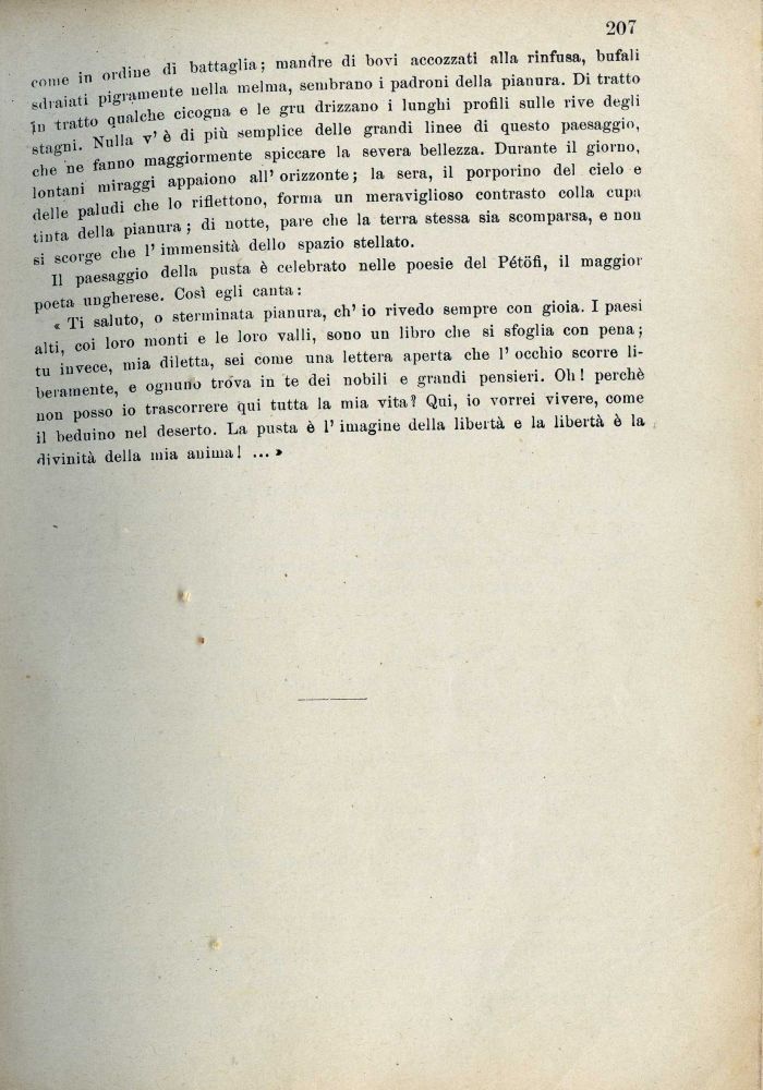 « Ti saluto, o sterminata pianura, eh' io rivedo sempre con gioia. I paesi alti, coi loro monti e le loro valli, sono un libro che si sfoglia con pena; tu invece, mia diletta, sei come una lettera aperta che 1' occhio scorre liberamente, e ognuno trova in te dei nobili e grandi pensieri. Oh! perchè non posso io trascorrere qui tutta la mia vita? Qui, io vorrei vivere, come il beduino nel deserto. La pusta è 1' iuiagine della libertà e la libertà è la divinità della mia animai ...»