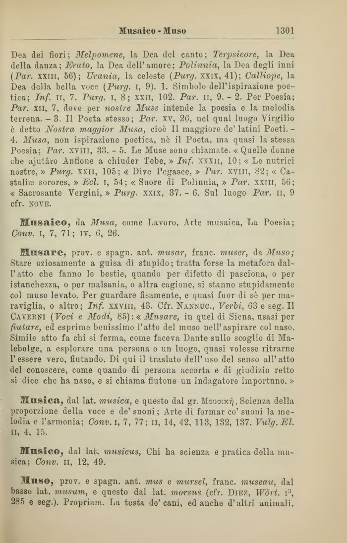 Dea dei fiori; Melpomene, la Dea del canto; Terpsicore, la Dea della danza; Erato, la Dea dell'amore; Polinnia, la Dea degli inni (Par. xxiii, 56); Urania, la celeste (Purg. xxix, 41); Calliope, la Dea della bella voce (Purg. i, 9). 1. Simbolo dell'ispirazione poetica; Inf. li, 7. Purg. i, 8; xxn, 102. Par. u, 9. - 2. Per Poesia; Par. xii, 7, dove per nostre Muse intende la poesia e la melodia terrena. - 3. Il Poeta stesso; Par. xv, 26, nel qual luogo Virgilio è detto Nostra maggior Musa, cioè II maggiore de' latini Poeti. -4. Musa, non ispirazione poetica, nè il Poeta, ma quasi la stessa Poesia; Par. xviii, 33. - 5. Le Muse sono chiamate. « Quelle donne che ajutàro Anfione a chiuder Tebe, » Inf. xxxii, 10; « Le nutrici nostre, » Purg. xxn, 105; « Dive Pegasee, » Par. xviii, 82; « Castali»! sorores, » Ecl. i, 54; « Suore di Polinnia, » Par. xxiii, 56; « Sacrosante Vergini, » Purg. xxix, 37. - 6. Sul luogo Par. li, 9 cfr. nove.