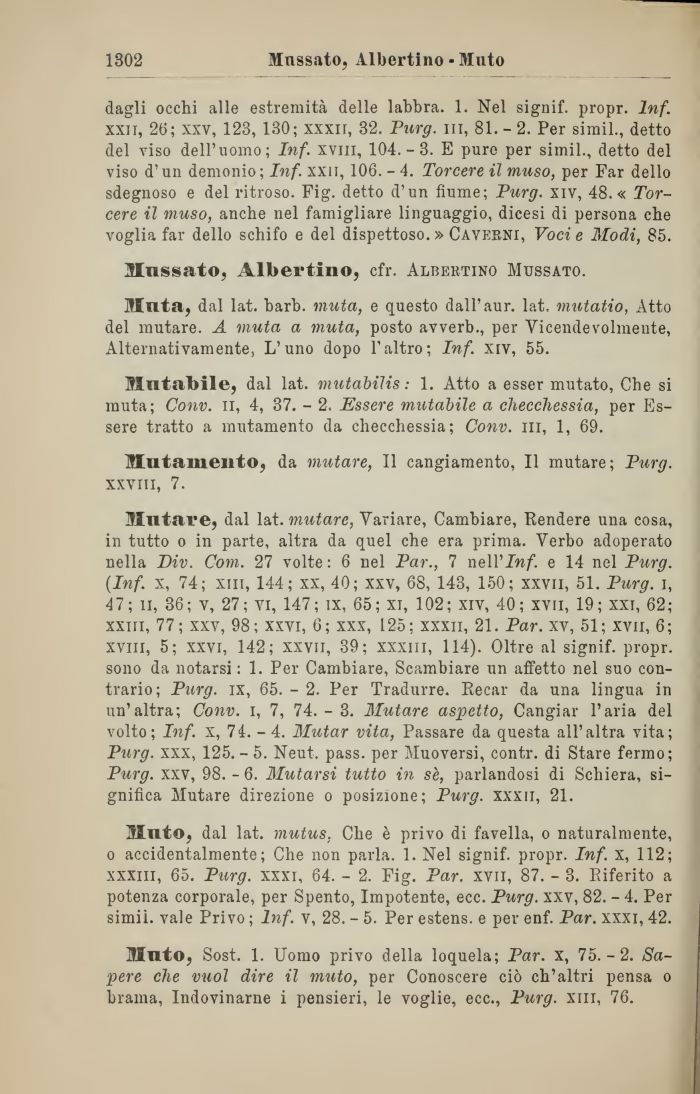 Muto, dal lat. mutus, Che è privo di favella, o naturalmente, o accidentalmente; Che non parla. 1. Nel signif. propr. Inf. x, 112; xxxiii, 65. Purg. xxxi, 64. - 2. Fig. Par. xvii, 87. - 3. Riferito a potenza corporale, per Spento, Impotente, ecc. Purg. xxv, 82. - 4. Per simii. vale Privo ; Inf. v, 28. - 5. Per estens. e per enf. Par. xxxi, 42.