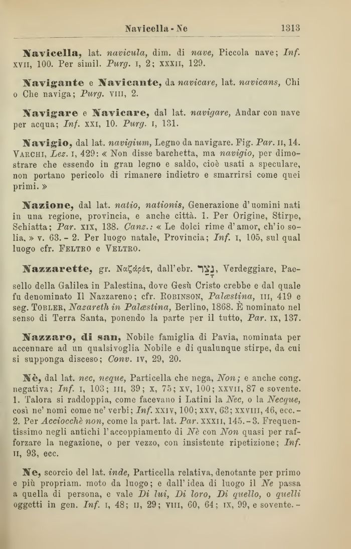 Ne, scorcio del lat. inde, Particella relativa, denotante per primo e più propriam. moto da luogo; e dall'idea di luogo il Ne passa a quella di persona, e vale Di lui, Di loro, Di quello, o quelli oggetti in gen. Inf. i, 48; il, 29; viri, 60, 64; ix, 99, e sovente.-
