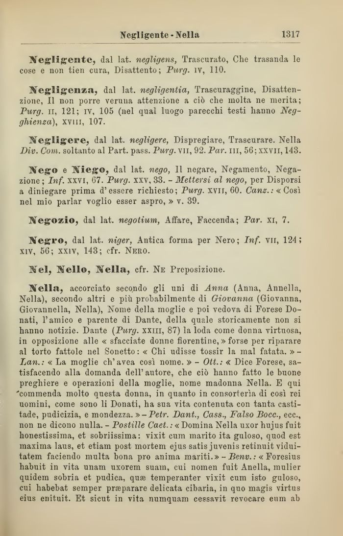 Nella, accorciato secondo gli uni di Anna (Anna, Annella, Nella), secondo altri e più probabilmente di Giovanna (Giovanna, Giovannella, Nella), Nome della moglie e poi vedova di Forese Donati, l'amico e parente di Dante, della quale storicamente non si hanno notizie. Dante (Purg. xxiii, 87) la loda come donna virtuosa, in opposizione alle « sfacciate donne fiorentine, » forse per riparare al torto fattole nel Sonetto : « Chi udisse tossir la mal fatata. » -Lan.: « La moglie ch'avea così nome. » - Ott.: « Dice Forese, satisfacendo alla domanda dell' autore, che ciò hanno fatto le buone preghiere e operazioni della moglie, nome madonna Nella. E qui 'commenda molto questa donna, in quanto in consorterìa di così rei uomini, come sono li Donati, ha sua vita contenuta con tanta casti-tade, pudicizia, e mondezza. »-Petr. Dani., Cass., Falso Boce., ecc., non ne dicono nulla. - Postille Caet. : « Domina Nella uxor hujus fuit honestissima, et sobriissima: vixit cum marito ita guloso, quod est maxima laus, et etiam post mortem ejus satis juvenis retinuit vidui-tatem faciendo multa bona prò anima mariti.» - Benv. : « Foresius habuit in vita unam uxorem suam, cui nomen fuit Anella, mulier quidem sobria et pudica, quse temperanter vixit cum isto guloso, cui habebat semper preparare delicata cibaria, in quo magis virtus eius enituit. Et sicut in vita numquam cessavit revocare enm ab