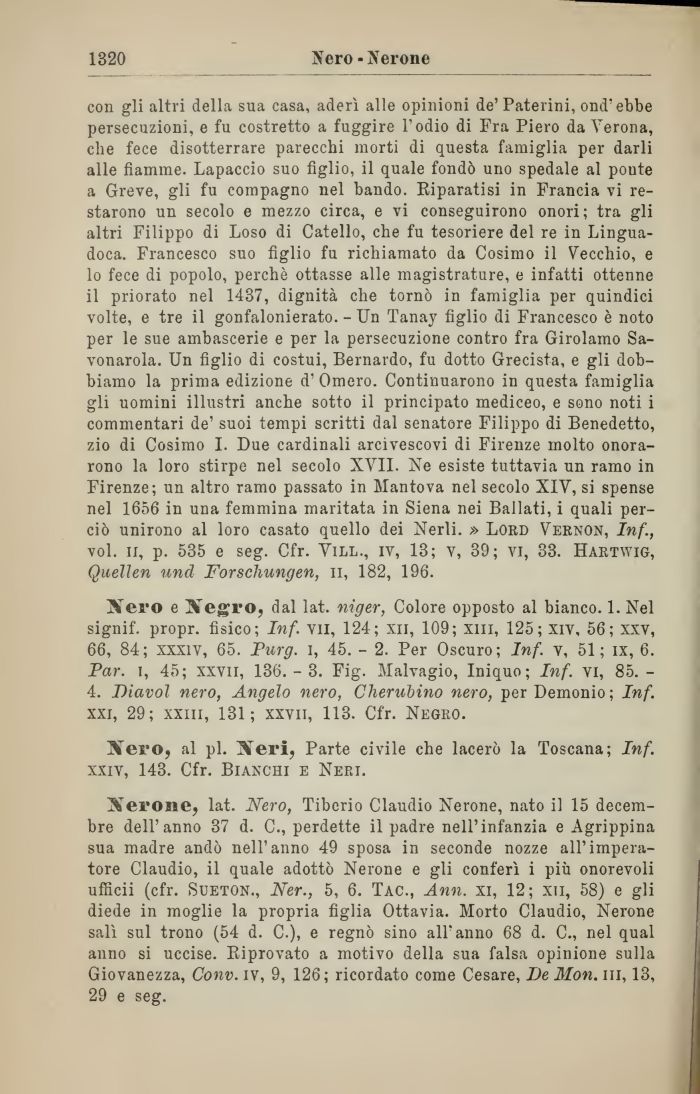 11 priorato nel 1437, dignità che tornò in famiglia per quindici volte, e tre il gonfalonierato. - Un Tanay figlio di Francesco è noto per le sue ambascerie e per la persecuzione contro fra Girolamo Savonarola. Un figlio di costui, Bernardo, fu dotto Grecista, e gli dobbiamo la prima edizione d'Omero. Continuarono in questa famiglia gli uomini illustri anche sotto il principato mediceo, e sono noti i commentari de' suoi tempi scritti dal senatore Filippo di Benedetto, zio di Cosimo I. Due cardinali arcivescovi di Firenze molto onorarono la loro stirpe nel secolo XVII. Ne esiste tuttavia un ramo in Firenze; un altro ramo passato in Mantova nel secolo XIV, si spense nel 1656 in una femmina maritata in Siena nei Ballati, i quali perciò unirono al loro casato quello dei Nerli. » Lord Vernon, Inf., voi. il, p. 535 e seg. Cfr. Vill., iv, 13; v, 39; vi, 33. Hartwig, Quellen und Forscliungen, n, 182, 196.
