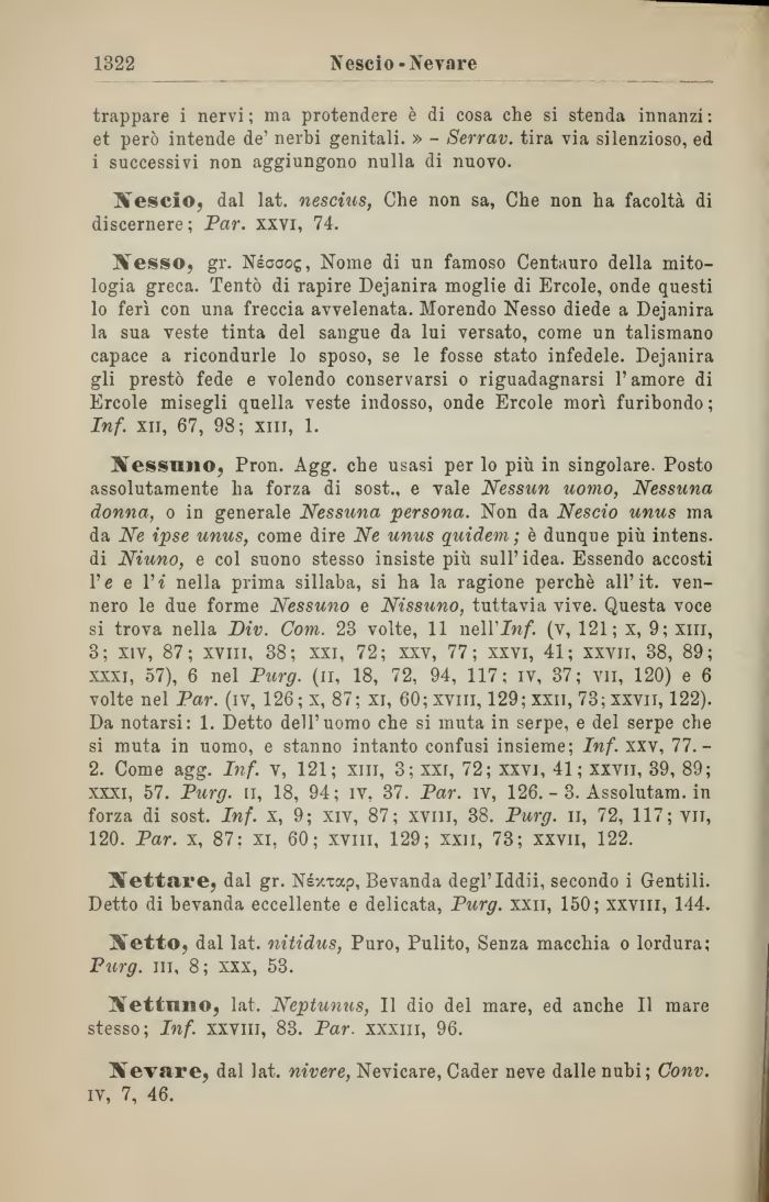 Nessuno, Pron. Agg. che usasi per lo più in singolare. Posto assolutamente ha forza di sost., e vale Nessun uomo, Nessuna donna, o in generale Nessuna persona. Non da Nescio unus ma da Ne ipse unus, come dire Ne unus quidem; è dunque più intens. di Niuno, e col suono stesso insiste più sull'idea. Essendo accosti l'è e l'i nella prima sillaba, si ha la ragione perchè all'it. vennero le due forme Nessuno e Nissuno, tuttavia vive. Questa voce si trova nella Div. Com. 23 volte, 11 nelVInf. (v, 121; x, 9; xiii, 3; xiv, 87; xviii, 38; xxi, 72; xxv, 77; xxvi, 41; xxvii, 38, 89; xxxi, 57), 6 nel Purg. (il, 18, 72, 94, 117; ìv, 37; vii, 120) e 6 volte nel Par. (ìv, 126; x, 87; xi, 60;xvhi, 129;xxil, 73;xxvh, 122). Da notarsi: 1. Detto dell'uomo che si muta in serpe, e del serpe che si muta in uomo, e stanno intanto confusi insieme; Inf. xxv, 77.-2. Come agg. Inf. v, 121; xiii, 3; xxi, 72; xxvi, 41; xxvii, 39, 89; xxxi, 57. Purg. u, 18, 94; ìv, 37. Par. iv, 126. - 3. Assolutam. in forza di sost. Inf. x, 9; xiv, 87; xviii, 38. Purg. n, 72, 117; vii, 120. Par. x, 87: xi, 60; xviii, 129; xxu, 73; xxvii, 122.