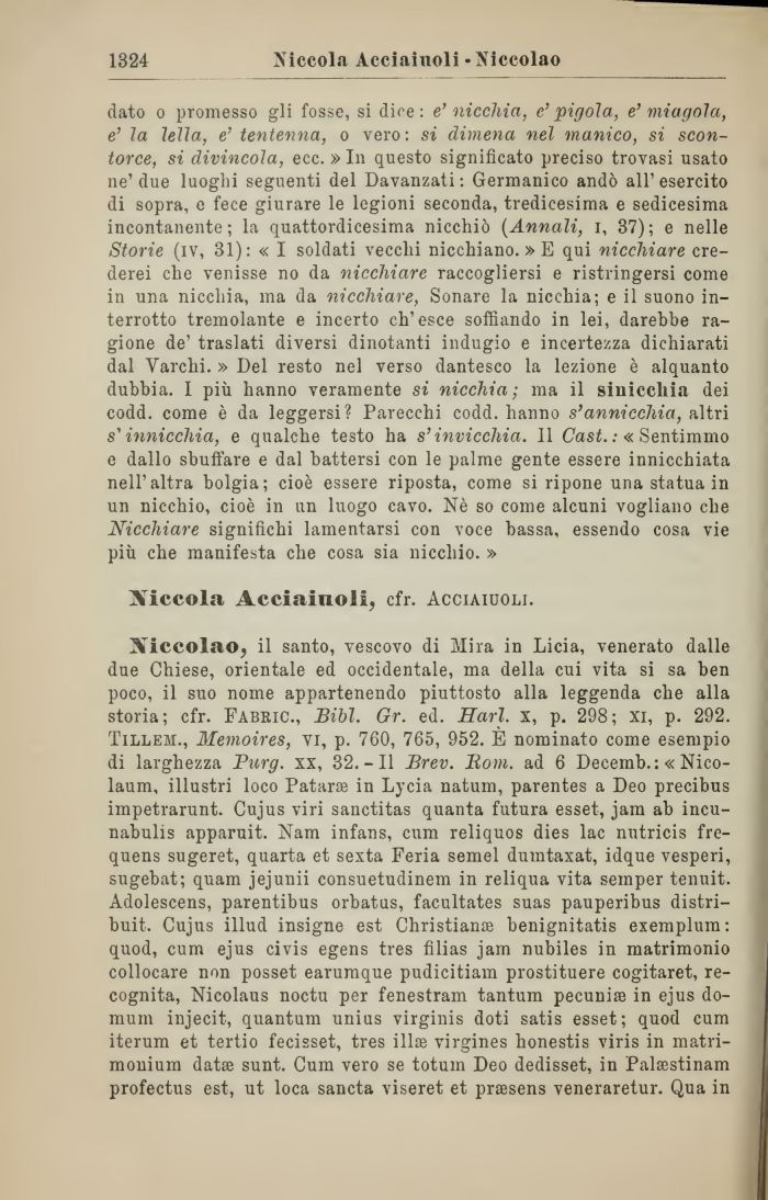 Xiccolao, il santo, vescovo di Mira in Licia, venerato dalle due Chiese, orientale ed occidentale, ma della cui vita si sa ben poco, il suo nome appartenendo piuttosto alla leggenda che alla storia; cfr. Fabric., Bibl. Gr. ed. Ilari, x, p. 298; xi, p. 292. Tillem., Memoires, vi, p. 760, 765, 952. È nominato come esempio di larghezza Purg. xx, 32.-Il Brev. Boni, ad 6 Decemb. : « Nico-laum, illustri loco Pataras in Lycia natum, parentes a Deo precibus impetrarunt. Cujus viri sanctitas quanta futura esset, jam ab incu-nabulis apparuit. Nam infans, cum reliquos dies lac nutricis fre-quens sugeret, quarta et sexta Feria semel dumtaxat, idque vesperi, sugebat; quam jejunii consuetudinem in reliqua vita semper tenuit. Adolescens, parentibus orbatus, facultates suas pauperibus distri— buit. Cujus illud insigne est Christian® benignitatis exemplum: quod, cum ejus civis egens tres filias jam nubiles in matrimonio collocare non posset earumque pudicitiam prostituere cogitaret, re-cognita, Nicolaus noctu per fenestram tantum pecunia} in ejus do-mum injecit, quantum unius virginis doti satis esset; quod cum iterum et tertio fecisset, tres illee virgines honestis viris in matri-mouium datse sunt. Cum vero se totum Deo dedisset, in Palsestinam profectus est, ut loca sancta viseret et praesens veneraretur. Qua in
