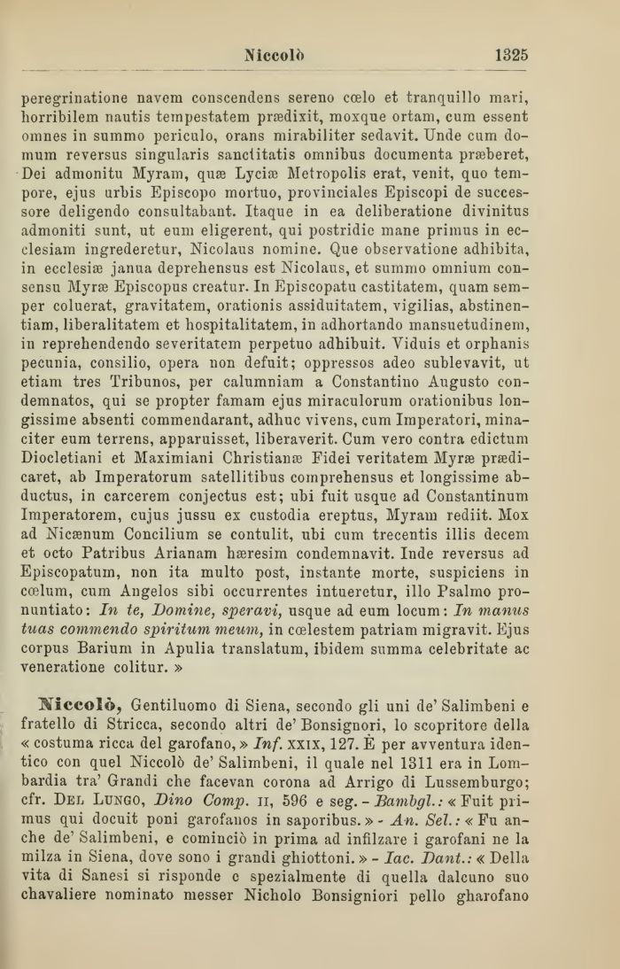 Niccolò, Gentiluomo di Siena, secondo gli uni de' Salimbeni e fratello di Stricca, secondo altri de' Bonsignori, lo scopritore della « costuma ricca del garofano, » Inf. xxix, 127. È per avventura identico con quel Niccolò de' Salimbeni, il quale nel 1311 era in Lombardia tra' Grandi che facevan corona ad Arrigo di Lussemburgo; cfr. Del Lungo, Dino Comp. n, 596 e seg. - Bambgl.: « Fuit primus qui docuit poni garofanos in saporibus. » - An. Sei. : « Fu anche de' Salimbeni, e cominciò in prima ad infilzare i garofani ne la milza in Siena, dove sono i grandi ghiottoni. » - Iac. Dant.: « Della vita di Sanesi si risponde e spezialmente di quella dalcuno suo chavaliere nominato messer Nicholo Bonsigniori pello gharofano