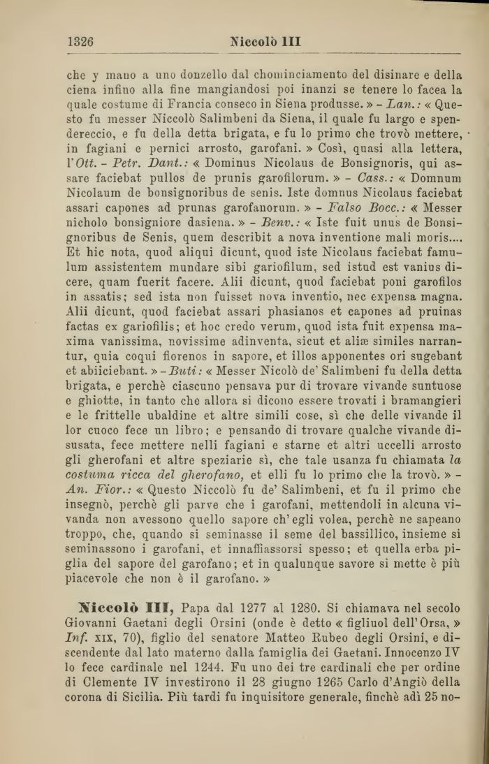 che y mano a uno donzello dal chominciamento del disinare e della ciena infino alla fine mangiandosi poi inanzi se tenere lo facea la quale costume di Francia conseco in Siena produsse. » - Lan. : « Questo fu messer Niccolò Salimbeni da Siena, il quale fu largo e spendereccio, e fu della detta brigata, e fu lo primo che trovò mettere, in fagiani e pernici arrosto, garofani. » Così, quasi alla lettera, VOtt. - Petr. Dant.: « Dominus Nicolaus de Bonsignoris, qui as-sare faciebat pullos de prunis garofilorum. » - Cass.: « Domnum Nicolaum de bonsignoribus de senis. Iste domnus Nicolaus faciebat assari capones ad prunas garofanorum. » - Falso Bocc.: « Messer nicholo bonsigniore dasiena. » - Benv.: « Iste fuit unus de Bonsignoribus de Senis, quem describit a nova inventione mali moris.... Et hic nota, quod aliqui dicunt, quod iste Nicolaus faciebat famu-lum assistentem mundare sibi gariofilum, sed istud est vanius dicere, quam fuerit facere. Alii dicunt, quod faciebat poni garofilos in assatis; sed ista non fuisset nova inventio, nec expensa magna. Alii dicunt, quod faciebat assari phasianos et capones ad pruinas factas ex gariofilis; et hoc credo veruni, quod ista fuit expensa maxima vanissima, novissime adinventa, sicut et alias similes narran-tur, quia coqui fiorenos in sapore, et illos apponentes ori sugebant et abiiciebant. »-Buti: « Messer Nicolò de' Salimbeni fu della detta brigata, e perchè ciascuno pensava pur di trovare vivande suntuose e ghiotte, in tanto che allora si dicono essere trovati i bramangieri e le frittelle ubaldine et altre simili cose, sì che delle vivande il lor cuoco fece un libro; e pensando di trovare qualche vivande disusata, fece mettere nelli fagiani e starne et altri uccelli arrosto gli gherofani et altre speziarie sì, che tale usanza fu chiamata la costuma ricca del glierofano, et elli fu lo primo che la trovò. » -An. Fior.: « Questo Niccolò fu de' Salimbeni, et fu il primo che insegnò, perchè gli parve che i garofani, mettendoli in alcuna vivanda non avessono quello sapore eh' egli volea, perchè ne sapeano troppo, che, quando si seminasse il seme del bassillico, insieme si seminassono i garofani, et innaffiassorsi spesso; et quella erba piglia del sapore del garofano; et in qualunque savore si mette è più piacevole che non è il garofano. »