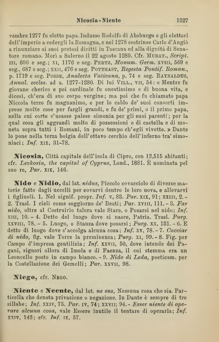 vembre 1277 fu eletto papa. Indusso Rodolfo di Absburgo e gli elettori dell'imperio a cedergli la Romagna, e nel 1278 costrinse Carlo d'Angiò a rinunziare ai suoi pretesi diritti in Toscana ed alla dignità di Senatore romano. Morì a Salerno il 22 agosto 1280. Cfr. Murat., Script. in, 606 e seg.; xi, 1176 e seg. Pertz, Monum. Germ. xvin, 569 e seg., 687 e seg.; xxn, 476 e seg. Potthast, Regesta Pontif. Roman., p. 1719 e seg. Posse, Analecta Vaticana, p. 74 e seg. Raynaldus, Annal. eccles. ad a. 1277-1280. Di lui Vill., vii, 54: « Mentre fu giovane cherico e poi cardinale fu onestissimo e di buona vita, e dicesi, ch'era di suo corpo vergine; ma poi che fu chiamato papa Niccola terzo fu magnanimo, e per lo caldo de' suoi consorti imprese molte cose per fargli grandi, e fu de' primi, o il primo papa, nella cui corte s'usasse palese simonia per gli suoi parenti; per la qual cosa gli aggrandì molto di possessioni e di castella e di moneta sopra tutti i Romani, in poco tempo ch'egli vivette. » Dante lo pone nella terza bolgia dell'ottavo cerchio dell'inferno tra' simoniaci; Inf. xix, 31-78.