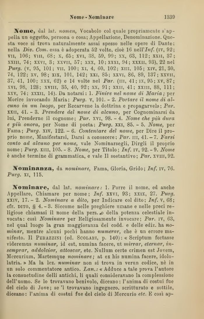 Nome, dui lat. nomen, Vocabolo col quale propriamente s'appella un oggetto, persona o cosa; Appellazione, Denominazione. Questa voce si trova naturalmente assai spesso nelle opere di Dante; nella Div. Com. essa è adoperata 52 volte, cioè 16 neWInf. (ìv, 92; vii, 106; vili, 68; x, 65; xvi, 38, 59, 99; xx, 63, 112; xxu, 37; xxm, 74; xxvi, 3; xxvii, 57; xxx, 10; xxxi, 94; xxxii, 93), 22 nel Purg. (v, 95, 101; Vii, 100; Xi, 4, 60, 102; xiii, 105; xiv, 21, 30, 74, 122; XV, 98; xix, 101, 142; xxi, 85; xxvi, 86, 89, 137; xxvii, 37, 41, 100; xxx, 62) e 14 volte nel Par. (ili, 41; ix, 95; xv, 87; xvi, 98, 128; xviit, 35, 40, 92; xx, 91; xxu, 41; xxm, 88, 111; xxv, 74; xxxii, 14). Da notarsi: 1. Finire nel nome di Maria; per Morire invocando Maria; Purg. v, 101. - 2. Portare il nome di alcuno in un luogo, per Recarvene la dottrina e propagarvela ; Par. xxu, 41. - 3. Prendere del nome di alcuno, per Cognominarsi da lui, Prenderne il cognome; Par. xvi, 98. -4. Nome che più dura e più onora, per Nome di poeta; Purg. xxi, 85. - 5. Nome, per Fama; Purg. xiv, 122. - 6. Contentare del nome, per Dire il proprio nome, Manifestarsi, Darsi a conoscere; Par. ni, 41. -7. Farsi conto ad alcuno per nome, vale Nominarsegli, Dirgli il proprio nome ; Purg. xiii, 105. - 8. Nome, per Titolo ; Inf. ìv, 92. - 9. Nome è anche termine di grammatica, e vale II sostantivo; Par. xviii, 92.