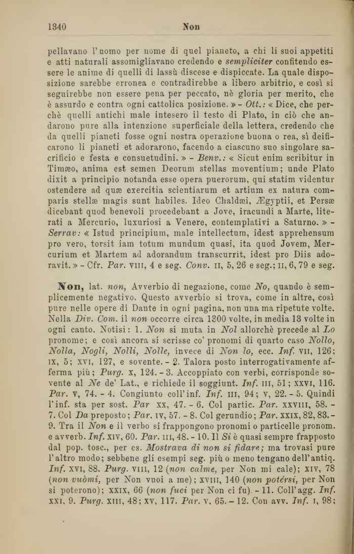 Non, lat. non, Avverbio di negazione, come No, quando è semplicemente negativo. Questo avverbio si trova, come in altre, così pure nelle opere di Daute in ogni pagina, non una ma ripetute volte. Nella Div. Com. il non occorre circa 1300 volte, in media 13 volte in ogni canto. Notisi : 1. Non si muta in Noi allorché precede al Lo pronome; e così ancora si scrisse co' pronomi di quarto caso Nollo, Nolla, Nogli, Nolli, Nolle, invece di Non lo, ecc. Inf. vii, 126; ix, 5; xvi, 127, e sovente. - 2. Talora posto interrogativamente afferma più; Purg. x, 124.-3. Accoppiato con verbi, corrisponde sovente al Ne de' Lat., e richiede il soggiunt. Inf. in, 51; xxvi, 116. Par. v, 74. - 4. Congiunto coli'inf. Inf. ni, 94; v, 22.-5. Quindi r inf. sta per sost. Par xx, 47. - 6. Col partic. Par. xxviii, 58. -7. Col Da preposto ; Par. iv, 57. - 8. Col gerundio ; Par. xxix, 82, 83. -9. Tra il Non e il verbo si frappongono pronomi o particelle pronom. e avverb. Inf. xiv, 60. Par. m, 48. - 10. Il Si è quasi sempre frapposto dal pop. tose., per es. Mostrava di non si fidar?.; ma trovasi pure l'altro modo; sebbene gli esempi seg. più o meno tengano dell'antiq. Inf. xvi, 88. Purg. vili, 12 (non calme, per Non mi cale); xiv, 78 (non vuòmi, per Non vuoi a me); xvill, 140 (non potérsi, per Non si poterono); xxix, 66 (non fuci per Non ci fu). -11. Coll'agg. Inf. xxi, 9. Purg. xm, 48; xv, 117. Par. v, 65.- 12. Con avv. Inf. i, 98;