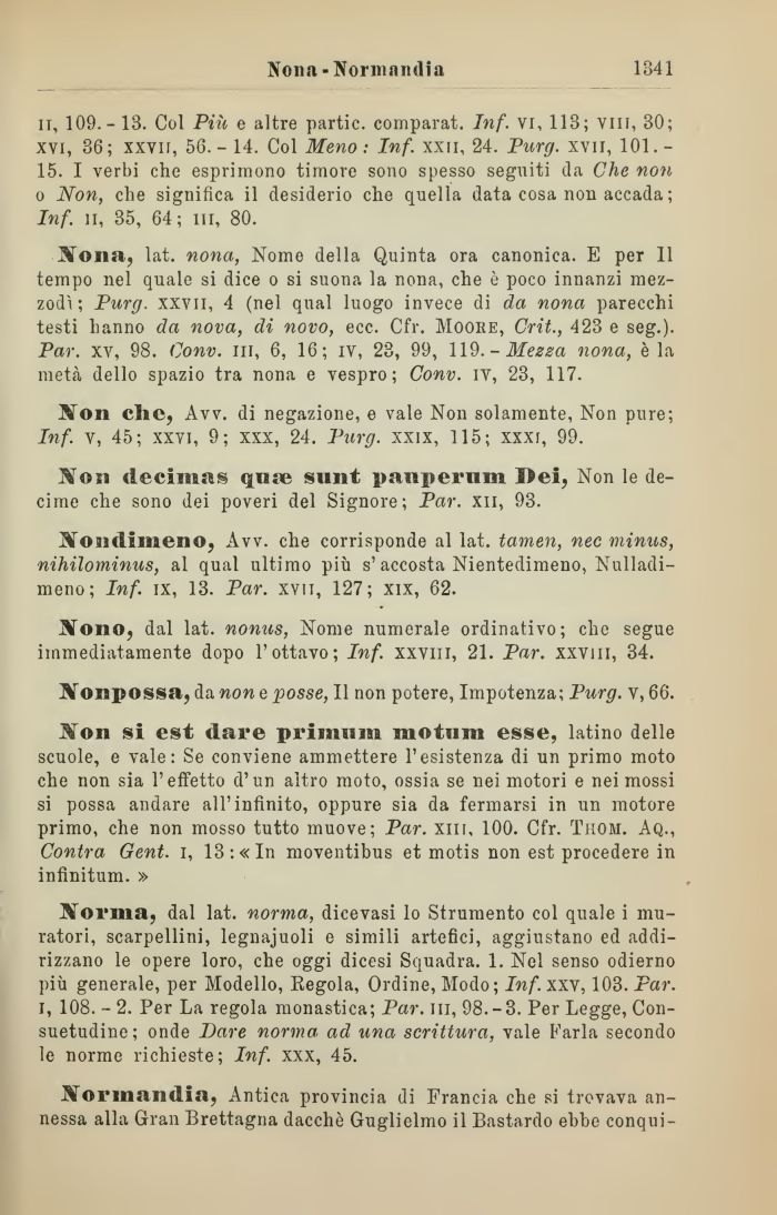 Nona, lat. nona, Nome della Quinta ora canonica. E per 11 tempo nel quale si dice o si suona la nona, che è poco innanzi mezzodì ; Purg. xxvil, 4 (nel qual luogo invece di da nona parecchi testi hanno da nova, di novo, ecc. Cfr. Moore, Crit., 423 e seg.). Par. xv, 98. Conv. in, 6, 16; iv, 23, 99, 119. - Messa nona, è la metà dello spazio tra nona e vespro; Conv. iv, 23, 117.