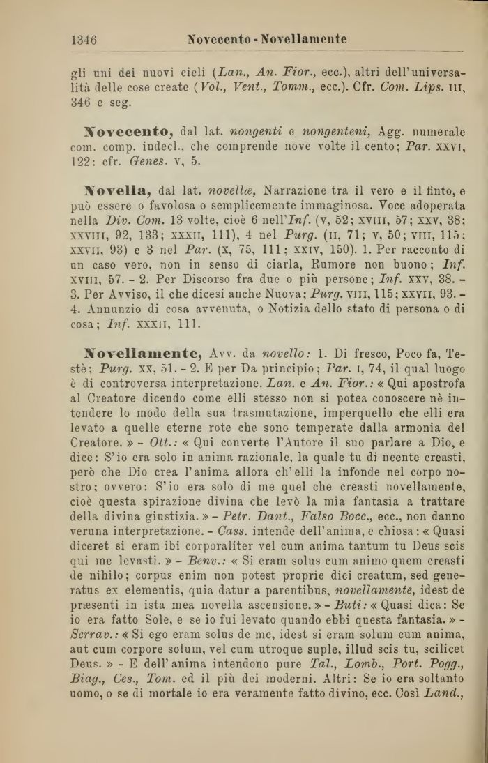 Novellamente, Avv. da novello: 1. Di fresco, Poco fa, Testé; Purg. xx, 51. - 2. E per Da principio; Par. i, 74, il qual luogo è di controversa interpretazione. Lan. e An. Fior.: « Qui apostrofa al Creatore dicendo come elli stesso non si potea conoscere né intendere lo modo della sua trasmutazione, imperquello che elli era levato a quelle eterne rote che sono temperate dalla armonia del Creatore. » - Ott. : « Qui converte l'Autore il suo parlare a Dio, e dice: S'io era solo in anima razionale, la quale tu di neente creasti, però che Dio crea l'anima allora eli'elli la infonde nel corpo nostro; ovvero: S'io era solo di me quel che creasti novellamente, cioè questa spirazione divina che levò la mia fantasia a trattare della divina giustizia. »- Petr. Dant., Falso Bocc., ecc., non danno veruna interpretazione. - Cass. intende dell'anima, e chiosa : « Quasi diceret si eram ibi corporaliter vel cum anima tantum tu Deus scis qui me levasti. » - Benv.: « Si eram solus cum animo quem creasti de nihilo; corpus enim non potest proprie dici creatum, sed gene-ratus ex elementis, quia datur a parentibus, novellamente, idest de presenti in ista mea novella ascensione. »- Buti: « Quasi dica: Se io era fatto Sole, e se io fui levato quando ebbi questa fantasia. » -Serrav.: « Si ego eram solus de me, idest si eram solum cum anima, aut cum corpore solum, vel cum utroque suple, illud scis tu, scilicet Deus. » - E dell' anima intendono pure Tal., Lomb., Port. Pogg., Biag., Ces., Tom. ed il più dei moderni. Altri: Se io era soltanto uomo, o se di mortale io era veramente fatto divino, ecc. Così Lanci.,