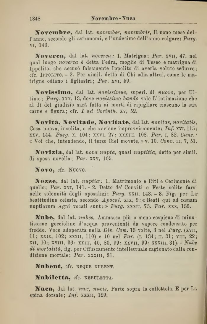 Nozze, dal lat. nuptice: 1. Matrimonio e Riti e Cerimonie di quello; Par. xvi, 141.-2. Detto de' Conviti e Feste solite farsi nelle solennità degli sposalizi; Purg. xxn, 143. - 3. Fig. per La-beatitudine celeste, secondo Apocal. xix, 9: «Beati qui ad ccenam nuptiarum Agni vocati sunt;» Purg. xxxn, 75. Par. xxx, 135.