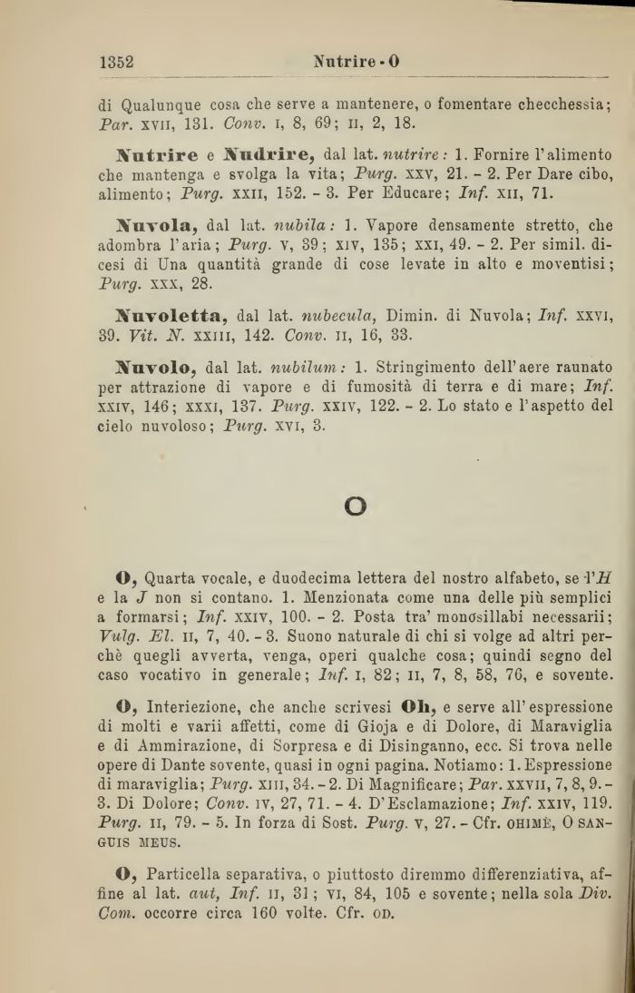 O, Interiezione, che anche scrivesi Oli, e serve all' espressione di molti e varii affetti, come di Gioja e di Dolore, di Maraviglia e di Ammirazione, di Sorpresa e di Disinganno, ecc. Si trova nelle opere di Dante sovente, quasi in ogni pagina. Notiamo: 1.Espressione di maraviglia; Purg. xiii, 34.-2. Di Magnificare; Par. xxvii, 7, 8, 9.-3. Di Dolore; Conv. ģv, 27, 71. - 4. D'Esclamazione; Inf. xxiv, 119. Purg. il, 79. - 5. In forza di Sost. Purg. v, 27. - Cfr. ohimč, 0 san-guis meus.