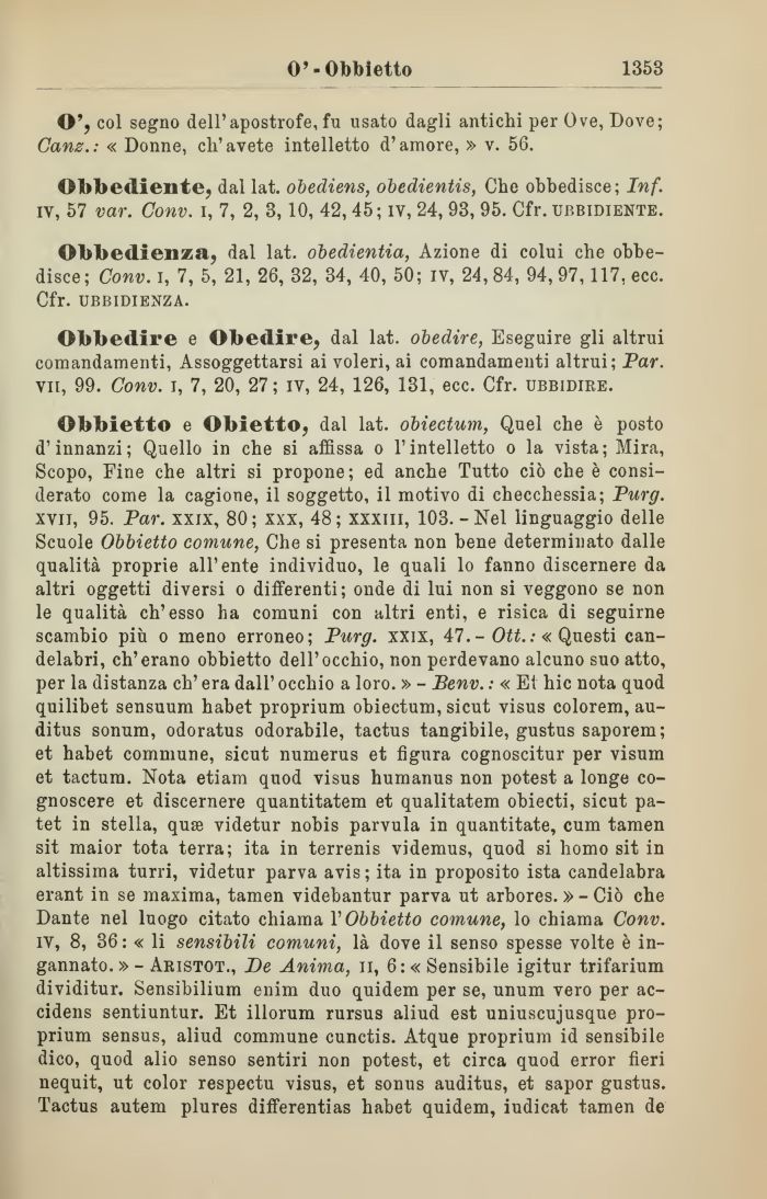 Obbietto e Obietto, dal lat. obiectum, Quel che è posto d'innanzi; Quello in che si affìssa o l'intelletto o la vista; Mira, Scopo, Fine che altri si propone; ed anche Tutto ciò che è considerato come la cagione, il soggetto, il motivo di checchessia; Purg. xvii, 95. Par. xxix, 80; xxx, 48; xxxiii, 103. - Nel linguaggio delle Scuole Obbietto comune, Che si presenta non bene determinato dalle qualità proprie all'ente individuo, le quali lo fanno discernere da altri oggetti diversi o differenti; onde di lui non si veggono se non le qualità ch'esso ha comuni con altri enti, e risica di seguirne scambio più o meno erroneo; Purg. xxix, 47.- Ott. .'«Questi candelabri, ch'erano obbietto dell'occhio, non perdevano alcuno suo atto, per la distanza eh' era dall' occhio a loro. » - Benv. : « Et hic nota quod quilibet sensuum habet proprium obiectum, sicut visus colorem, au-ditus sonum, odoratus odorabile, tactus tangibile, gustus saporem; et habet commane, sicut numerus et figura cognoscitur per visum et tactum. Nota etiam quod visus humanus non potest a longe co-gnoscere et discernere quantitatem et qualitatem obiecti, sicut pa-tet in stella, qua videtur nobis parvula in quantitate, cum tamen sit maior tota terra; ita in terrenis videmus, quod si homo sit in altissima turri, videtur parva avis; ita in proposito ista candelabra erant in se maxima, tamen videbantur parva ut arbores. » - Ciò che Dante nel luogo citato chiama VObbietto comune, lo chiama Conv. iv, 8, 36 : « li sensibili comuni, là dove il senso spesse volte è ingannato. »- Aristot., De Anima, il, 6: «Sensibile igitur trifarium dividitur. Sensibilium enim duo quidem per se, unum vero per ac-cidens sentiuntur. Et illorum rursus aliud est uniuscujusque proprium sensus, aliud commane cunctis. Atque proprium id sensibile dico, quod alio senso sentiri non potest, et circa quod error fieri nequit, ut color respectu visus, et sonns auditus, et sapor gustus. Tactus autem plures differentias habet quidem, iudicat tamen de