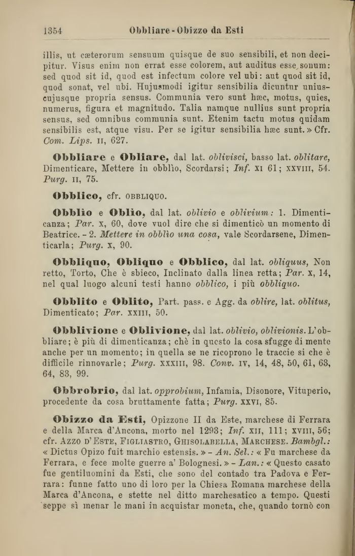 Obbliare e Obliare, dal lat. oblivisci, basso lat. oblitare, Dimenticare, Mettere in obblìo, Scordarsi ; Inf. xi 61 ; xxviit, 54. Purg. il, 75.