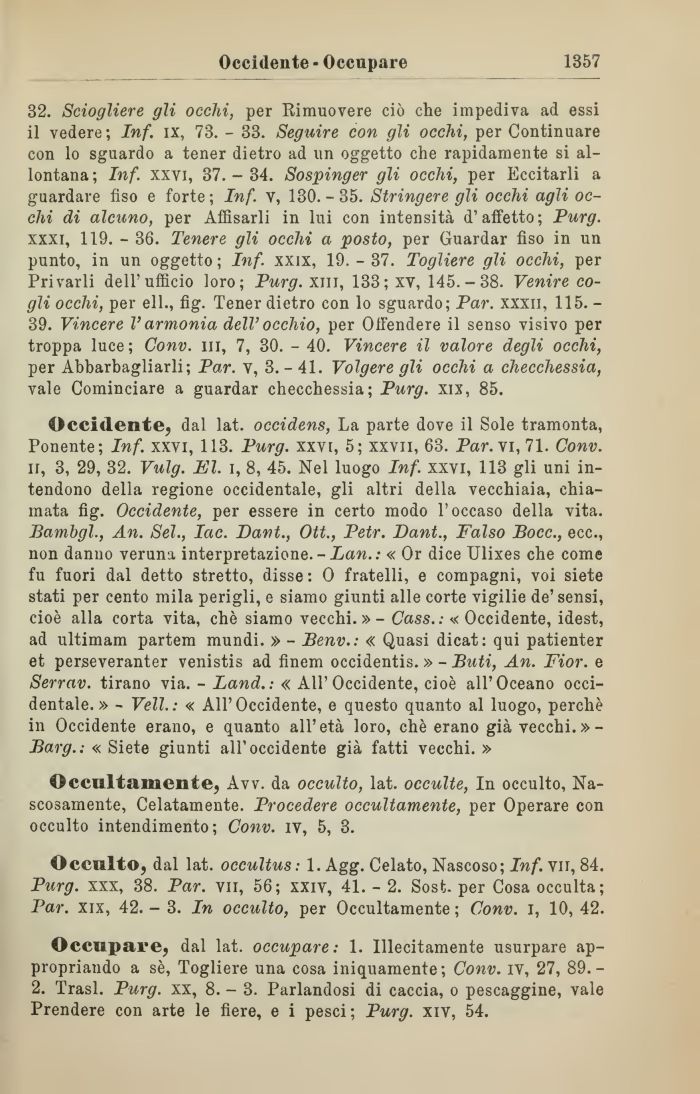 32. Sciogliere gli occhi, per Rimuovere ciò che impediva ad essi il vedere; Inf. ix, 73. - 33. Seguire con gli occhi, per Continuare con lo sguardo a tener dietro ad un oggetto che rapidamente si allontana ; Inf. xxvi, 37. - 34. Sospinger gli occhi, per Eccitarli a guardare fiso e forte; Inf. v, 130.-35. Stringere gli occhi agli occhi di alcuno, per Affisarli in lui con intensità d'affetto; Purg. xxxi, 119. - 36. Tenere gli occhi a posto, per Guardar fiso in un punto, in un oggetto ; Inf. xxix, 19. - 37. Togliere gli occhi, per Privarli dell'ufficio loro; Purg. xm, 133; xv, 145.-38. Venire cogli occhi, per eli., fig. Tener dietro con lo sguardo; Par. xxxii, 115. -39. Vincere V armonia dell' occhio, per Offendere il senso visivo per troppa luce; Conv. ni, 7, 30. - 40. Vincere il valore degli occhi, per Abbarbagliarli; Par. v, 3.-41. Volgere gli occhi a checchessia, vale Cominciare a guardar checchessia; Purg. xix, 85.
