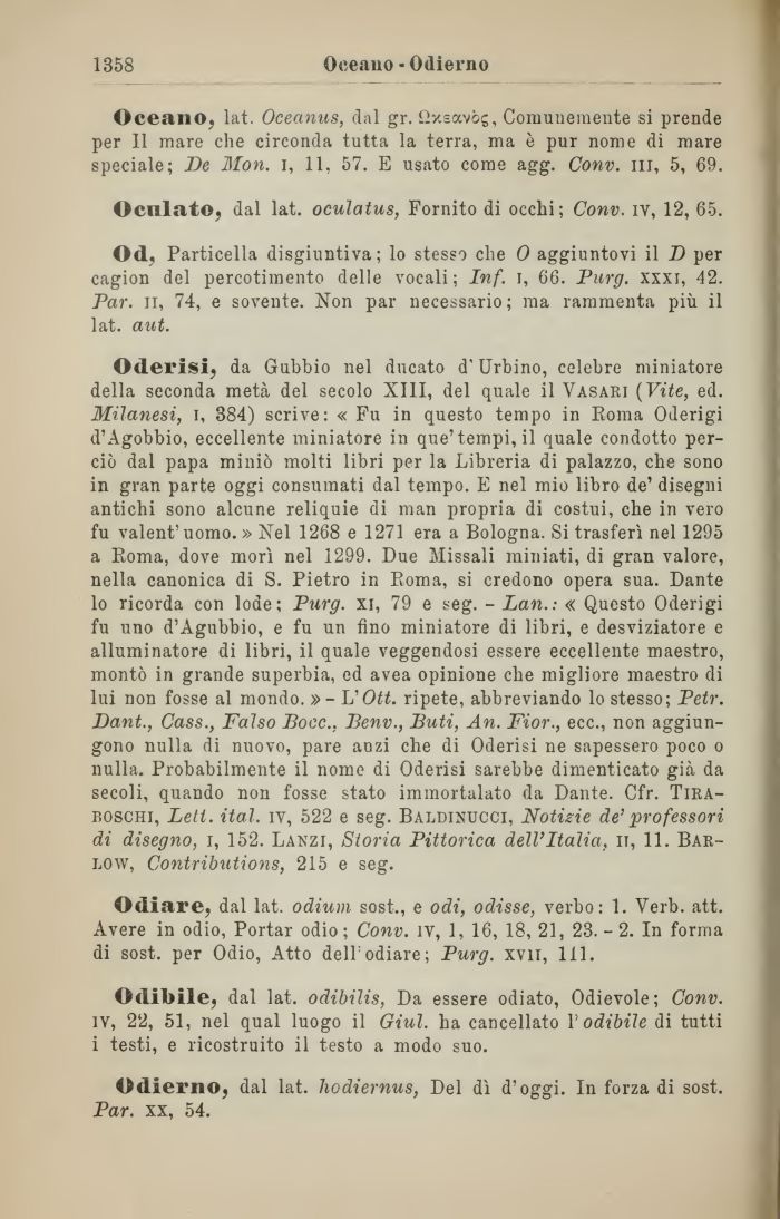 Oderisi, da Gubbio nel ducato d'Urbino, celebre miniatore della seconda metà del secolo XIII, del quale il Vasari (Vite, ed. Milanesi, i, 384) scrive: « Fu in questo tempo in Roma Oderigi d'Agobbio, eccellente miniatore in que'tempi, il quale condotto perciò dal papa miniò molti libri per la Libreria di palazzo, che sono in gran parte oggi consumati dal tempo. E nel mio libro de' disegni antichi sono alcune reliquie di man propria di costui, che in vero fu valent'uomo. » Nel 1268 e 1271 era a Bologna. Si trasferì nel 1295 a Roma, dove morì nel 1299. Due Missali miniati, di gran valore, nella canonica di S. Pietro in Roma, si credono opera sua. Dante lo ricorda con lode; Purg. xi, 79 e seg. - Lan.: « Questo Oderigi fu uno d'Agubbio, e fu un fino miniatore di libri, e desviziatore e alluminatore di libri, il quale veggendosi essere eccellente maestro, montò in grande superbia, ed avea opinione che migliore maestro di lui non fosse al mondo. » - L'Ott. ripete, abbreviando lo stesso; Petr. Dant., Cass., Falso Boec., Benv., Buti, An. Fior., ecc., non aggiungono nulla di nuovo, pare anzi che di Oderisi ne sapessero poco o nulla. Probabilmente il nome di Oderisi sarebbe dimenticato già da secoli, quando non fosse stato immortalato da Dante. Cfr. Tira-boschi, Leti. ital. iv, 522 e seg. Baldinucci, Notizie de'professori di disegno, i, 152. Lanzi, Storia Pittorica dell'Italia, lì, 11. Bar-low, Contributions, 215 e seg.