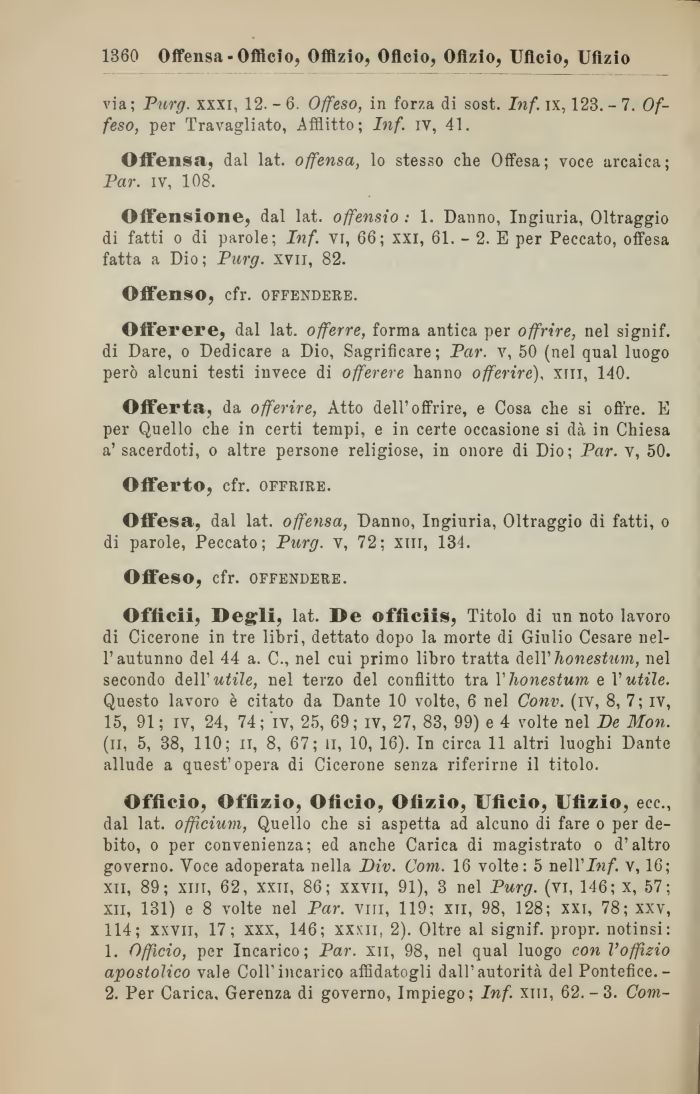 Officii, Degli, lat. De offìciis, Titolo di un noto lavoro di Cicerone in tre libri, dettato dopo la morte di Giulio Cesare nell'autunno del 44 a. C., nel cui primo libro tratta dell' honestum, nel secondo dell' utile, nel terzo del conflitto tra V lionestum e V utile. Questo lavoro è citato da Dante 10 volte, 6 nel Conv. (iv, 8, 7; iv, 15, 91 ; iv, 24, 74; 'iv, 25, 69; iv, 27, 83, 99) e 4 volte nel De Mon. (il, 5, 38, 110; il, 8, 67; II, 10, 16). In circa 11 altri luoghi Dante allude a quest'opera di Cicerone senza riferirne il titolo.