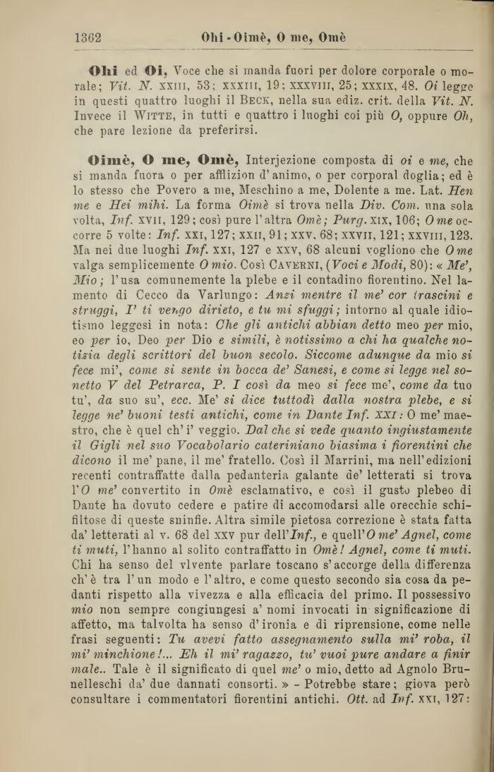 10 stesso che Povero a me, Meschino a me, Dolente a me. Lat. Hen me e Hei mihi. La forma Oimè si trova nella Div. Com. una sola volta, Inf. xvii, 129; così pure l'altra Omè; Purg.xix, 106; Ome occorre 5 volte: Inf. xxi, 127; xxii, 91 ; xxv. 68; xxvii, 121; xxviii, 123. Ma nei due luoghi Inf. xxi, 127 e xxv, 68 alcuni vogliono che Ome valga semplicemente 0 mio. Così Caverni, ( Voci e Modi, 80): « Me', Mio; l'usa comunemente la plebe e il contadino fiorentino. Nel lamento di Cecco da Varlungo: Anzi mentre il me' cor trascini e struggi, I' ti vengo dirieto, e tu mi sfuggi; intorno al quale idiotismo leggesi in nota: Che gli antichi abbian detto meo per mio, eo per io, Deo per Dio e simili, è notissimo a chi ha qualche notizia degli scrittori del buon secolo. Siccome adunque da mio si fece mi', come si sente in bocca de' Sanesi, e come si legge nel sonetto V del Petrarca, P. I così da meo si fece me', come da tuo tu', da suo su', ecc. Me' si dice tuttodì dalla nostra plebe, e si legge ne' buoìii testi antichi, come in Dante Inf. xxi : 0 me'maestro, che è quel eh' i' veggio. Dal che si vede quanto ingiustamente