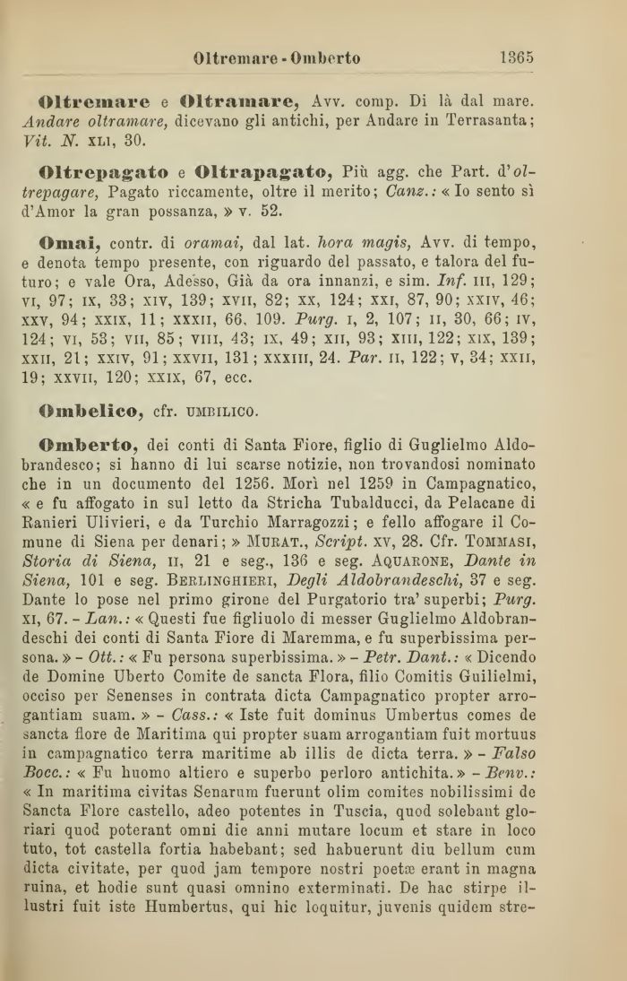 Omberto, dei conti di Santa Fiore, figlio di Guglielmo Aldo-brandesco; si hanno di lui scarse notizie, non trovandosi nominato che in un documento del 1256. Morì nel 1259 in Oampagnatico, « e fu affogato in sul letto da Stricha Tubalducci, da Pelacane di Ranieri Ulivieri, e da Turchio Marragozzi ; e fello affogare il Comune di Siena per denari ; » Murat., Script, xv, 28. Cfr. Tohmasi, Storia di Siena, n, 21 e seg., 136 e seg. Aquarone, Dante in Siena, 101 e seg. Berlinghieri, Degli Al dob rande sdii, 37 e seg. Dante lo pose nel primo girone del Purgatorio tra'superbi; Purg. xi, 67. - Lan.: « Questi fue figliuolo di messer Guglielmo Aldobran-deschi dei conti di Santa Fiore di Maremma, e fu superbissima persona. » - Ott. : « Fu persona superbissima. » - Petr. Dant. : « Dicendo de Domine Uberto Gomite de sancta Flora, Alio Comitis Guilielmi, occiso per Senenses in contrata dieta Campagnatico propter arro-gantiam suam. » - Cass.: « Iste fuit dominus Umbertus comes de sancta flore de Maritima qui propter suam arrogantiam fuit mortuus in campagnatico terra maritime ab illis de dieta terra. » - Falso Bocc.: « Fu huomo altiero e superbo perloro antichità.» -Benv.: « In maritima civitas Senarum fuerunt olim comites nobilissimi de Sancta Flore castello, adeo potentes in Tuscia, quod solebant glo-riari quod poterant omni die anni mutare locum et stare in loco tuto, tot castella fortia habebant; sed habuerunt diu bellum cum dieta civitate, per quod jam tempore nostri poetse erant in magna ruina, et hodie sunt quasi omnino exterminati. De hac stirpe illustri fuit iste Humbertus, qui hic loquitur, juvenis quidem stre-