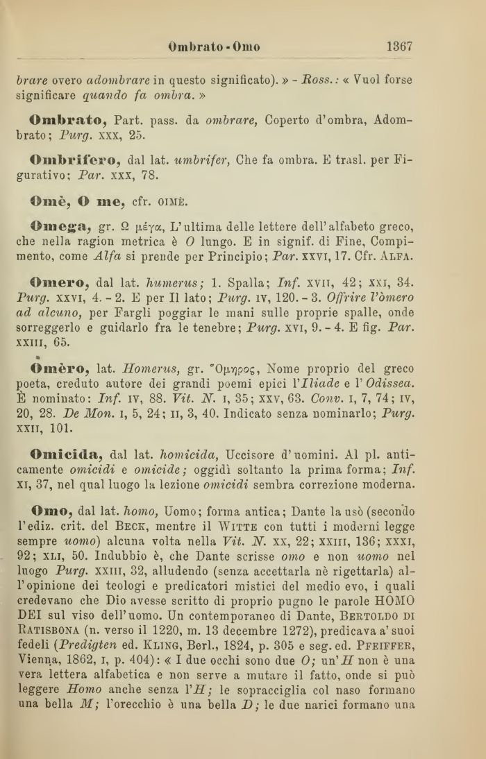 Omo, dal lat. homo, Uomo; forma antica; Dante la usò (secondo l'ediz. crit. del Beck, mentre il Witte con tutti i moderni legge sempre uomo) alcuna volta nella Vit. N. xx, 22; xxm, 136; xxxi, 92 ; xli, 50. Indubbio è, che Dante scrisse omo e non uomo nel luogo Purg. xxm, 32, alludendo (senza accettarla nè rigettarla) all'opinione dei teologi e predicatori mistici del medio evo, i quali credevano che Dio avesse scritto di proprio pugno le parole HOMO DEI sul viso dell'uomo. Un contemporaneo di Dante, Bertoldo di Ratisbona (n. verso il 1220, m. 13 decembre 1272), predicava a'suoi fedeli (Predigten ed. Ivling, Beri., 1824, p. 305 e seg. ed. Pfeiffer, Vienna, 1862, I, p. 404): « I due occhi sono due O; un'il non è una vera lettera alfabetica e non serve a mutare il fatto, onde si può leggere Homo anche senza YH; le sopracciglia col naso formano una bella M; l'orecchio è una bella D ; le due narici formano una