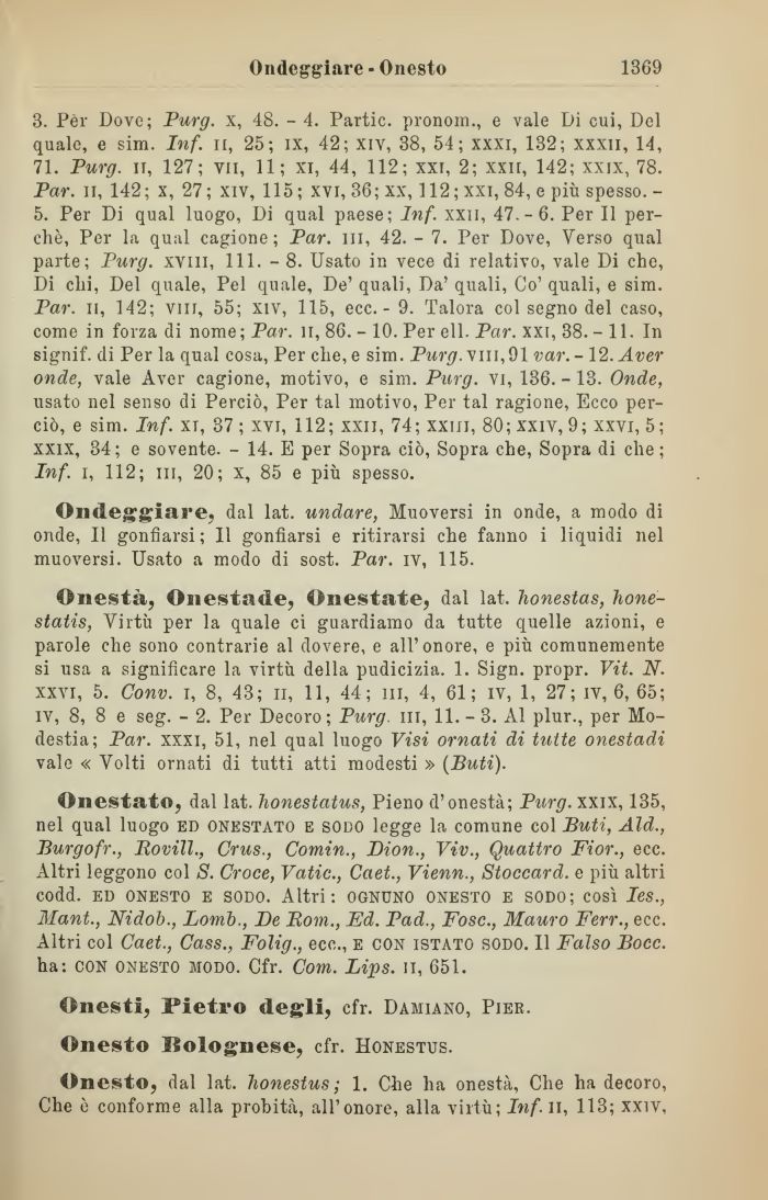 3. Per Dove; Purg. x, 48. - 4. Partic. pronom., e vale Di cui, Del quale, e sim. Inf. n, 25; ix, 42; xiv, 38, 54; xxxi, 132; xxxii, 14, 71. Purg. il, 127; vii, 11; xi, 44, 112; xxi, 2; xxn, 142; xxix, 78. Par. n, 142; x, 27; xiv, 115; xvi, 36; xx, 112;xxi, 84, e più spesso. -5. Per Di qual luogo, Di qual paese; Inf. xxii, 47.-6. Per II perchè, Per la qual cagione; Par. ni, 42. - 7. Per Dove, Verso qual parte; Purg. xvm, 111. - 8. Usato in vece di relativo, vale Di che, Di chi, Del quale, Pel quale, De' quali, Da' quali, Co' quali, e sim. Par. il, 142; vili, 55; xiv, 115, ecc. - 9. Talora col segno del caso, come in forza di nome; Par. li, 86. - 10. Per eli. Par. xxi, 38.-11. In signif. di Per la qual cosa, Per che, e sim. Purg. vili, 91 var. - 12. Aver onde, vale Aver cagione, motivo, e sim. Purg. vi, 136. -13. Onde, usato nel senso di Perciò, Per tal motivo, Per tal ragione, Ecco perciò, e sim. Inf. xt, 37 ; xvi, 112; xxij, 74; xxiii, 80; xxiv, 9; xxvi, 5; xxix, 34; e sovente. - 14. E per Sopra ciò, Sopra che, Sopra di che; Inf. i, 112; in, 20; x, 85 e più spesso.