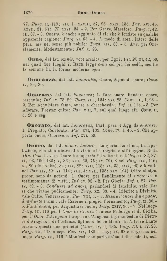 6. Farsi onore, per Acquistarsi onore ; Purg. xxiv, 96. - 7. Nel luogo Purg. ni, 116 per 1' Onor di Cicilia è inteso Federigo re di Sicilia, per 1' Onor d'Aragona Iacopo re d'Aragona, figli ambedue di Pietro re d'Aragona e di Costanza, figliuola del re Manfredi. Altrove Dante biasima questi due principi (Conv. iv, 6, 135. Vulg. El. i, 12, 28. Purg. vii, 118 e seg. Par. xix, 130 e seg.; xx, 62 e seg.); ma nel luogo Purg. ni, 116 è Manfredi che parla de' suoi discendenti, non