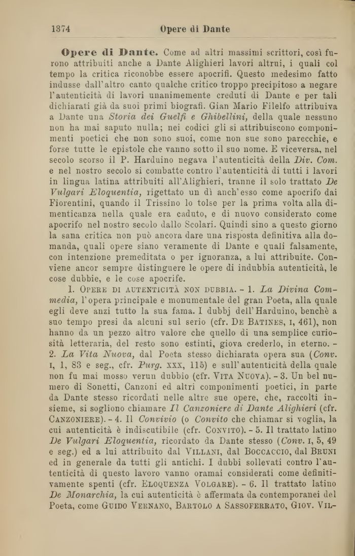 Opere di Dante. Come ad altri massimi scrittori, così furono attribuiti anche a Dante Alighieri lavori altrui, i quali col tempo la critica riconobbe essere apocrifi. Questo medesimo fatto indusse dall'altro canto qualche critico troppo precipitoso a negare l'autenticità di lavori unanimemente creduti di Dante e per tali dichiarati già da suoi primi biografi. Gian Mario Filelfo attribuiva a Dante una Storia dei Guelfi e Ghibellini, della quale nessuno non ha mai saputo nulla; nei codici gli si attribuiscono componimenti poetici che non sono suoi, come non sue sono parecchie, e forse tutte le epistole che vanno sotto il suo nome. E viceversa, nel secolo scorso il P. Harduino negava l'autenticità della Div. Com. e nel nostro secolo si combatte contro l'autenticità di tutti i lavori in lingua latina attribuiti all'Alighieri, tranne il solo trattato De Vulgari Eloquentia, rigettato un dì anch'esso come apocrifo dai Fiorentini, quando il Trissino lo tolse per la prima volta alla dimenticanza nella quale era caduto, e di nuovo considerato come apocrifo nel nostro secolo dallo Scolari. Quindi sino a questo giorno la sana critica non può ancora dare una risposta definitiva alla domanda, quali opere siano veramente di Dante e quali falsamente, con intenzione premeditata o per ignoranza, a lui attribuite. Conviene ancor sempre distinguere le opere di indubbia autenticità, le cose dubbie, e le cose apocrife.