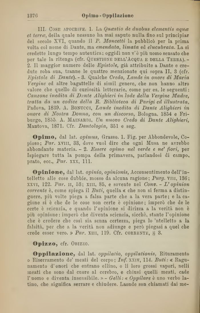 III. Cose apocrife. 1. La Quaestio de duobus elementis aquce et terree, della quale nessuno lia mai saputo nulla fino sul principiar del secolo XYI, quando il P. Moncetti la pubblicò per la prima volta col nome di Dante, ma emendata, limata ed elucubrata. La si credette lungo tempo autentica; oggidì non v'è più uomo sensato che per tale la ritenga (cfr. Questione dell'Acqua e della Terra). -2. Il maggior numero delle Epistole, già attribuite a Dante e credute roba sua, tranne le quattro menzionate qui sopra II, 3 (cfr. Epistole di Dante). - 3. Qualche Credo, Laude in onore di Maria Vergine ed altre bagattelle di simil genere, che non hanno altro valore che quello di curiosità letterarie, come per es. le seguenti : Canzone inedita di Dante Alighieri in lode della Vergine Madre, tratta da un codice della B. Biblioteca di Parigi ed illustrata, Padova, 1839. A. Bonucci, Laude inedita di Dante Alighieri in onore di Nostra Donna, con un discorso, Bologna, 1854 e Friburgo, 1855. A. Mainardi, Un nuovo Credo di Dante Alighieri, Mantova, 1871. Cfr. Dantologia, 351 e seg.