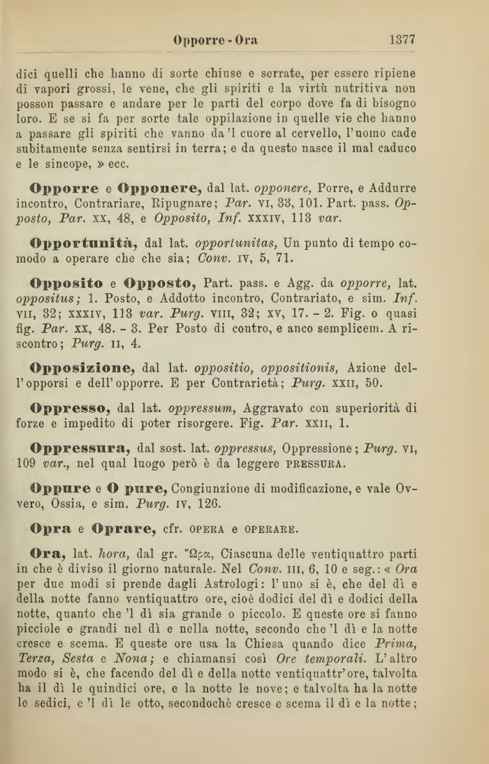 Ora, lat. liora, dal gr. Qpa, Ciascuna delle ventiquattro parti in che è diviso il giorno naturale. Nel Conv. ili, 6, 10 e seg.: « Ora per due modi si prende dagli Astrologi: l'uno si è, che del dì e della notte fanno ventiquattro ore, cioè dodici del dì e dodici della notte, quanto che '1 dì sia grande o piccolo. E queste ore si fanno picciole e grandi nel dì e nella notte, secondo che '1 dì e la notte cresce e scema. E queste ore usa la Chiesa quando dice Prima, Terza, Sesta e Nona; e chiamansi così Ore temporali. L'altro modo si è, che facendo del dì e della notte ventiquattr'ore, talvolta ha il dì le quindici ore, e la notte le nove; e talvolta ha la notte le sedici, e '1 dì le otto, secondochè cresce e scema il dì e la notte ;