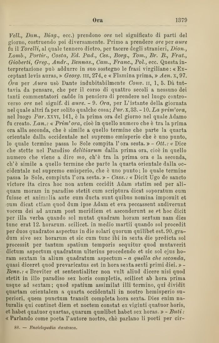 Veli., Dan., Biag., ecc.) prendono ore nel significato di parti del giorno, costruendo poi diversamente. Primo a prendere ore per aure fu il Torelli, al quale tennero dietro, per tacere degli stranieri, Dion., Lomb., Portir., Costa, Ed. Pad., Ces., Borg., Tom., Br. B., Frat., Gioberti, Greg., Andr., Bennas., Cam., Frane., Poi-, ecc. Questa interpretazione può addurre in suo sostegno le frasi virgiliane :« Ex-ceptant levis auras, » Georg, ni, 274, e « Elamina prima, » Aen. x, 97. Óra per Aura usò Dante indubitabilmente Conv. il, 1, 5. Dà tuttavia da pensare, che per il corso di quattro secoli a nessuno dei tanti commentatori cadde in pensiero di prendere nel luogo controverso ore nel signif. di aure. - 9. Ora, per L'istante della giornata nel quale altri fa per solito qualche cosa; Par. x,33. - 10. La prim'ora, nel luogo Par. xxvi, 141, è la prima ora del giorno nel quale Adamo fu creato. Lan.: « Prim'ora, cioè in quello numero che è tra la prima ora alla seconda, che è simile a quello termine che parte la quarta orientale dalla occidentale nel supremo emisperio che è uno punto, lo quale termine passa lo Sole compita l'ora sesta.» - 0^.:«Dice che stette nel Paradiso delitiarum dalla prima ora, cioè in quello numero che viene a dire mo, eh'è tra la prima ora e la seconda, eh'è simile a quello termine che parte la quarta orientale dalla occidentale nel supremo emisperio, che è uno punto; lo quale termine passa lo Sole, compiuta l'ora sesta. » - Cass.: « Dicit Ugo de sancto victore ita circa hoc non autem cecidit Adam statim sed per ali-quam moram in paradiso stetit cum scriptura dicat soporatum eum fuisse et animalia ante eum ducta sunt quibus nomina imposuit et cum dicat etiam quod dum ipse Adam et èva peccassent audiverunt vocem dei ad auram post meridiem et asconderunt se et hoc dicit per illa verba quando sol mutat quadram horam sextam narn dies tunc erat 12. horarum. scilicet. in medio rnartii quando sol procedit per duos quadratos aspectus in die solari quorum quilibet est. 90. gra-dum sive sex horarum et sic cum tunc ibi in sexta die predicta sol processit per tantum spatium temporis sequitur quod mutaverit dictum aspectum quadratum ulterius procedendo et sic sol ejus horam sextam in alium quadratum aspectum - a quella che seconda, quasi diceret quod prevaricatus est in hora sexta sexti primi diei. » -Benv.: « Breviter et sententialiter non vult aliud dicere nisi quod stetit in ilio paradiso sex horis completis, scilicet ab hora prima usque ad sextam; quod spatium assimilat i 1 li termino, qui dividit quartam orientalem a quarta occidentali in nostro hemisperio superiori, quem punctum transit completa hora sexta. Dies enim na-turalis qui continet diem et noctem constat ex viginti quatuor horis, et habet quatuor quartas, quarum quaelibet habet sex horas. » - Buti : «Parlando come poeta l'autore nostro, chè parlano li poeti per cir-
