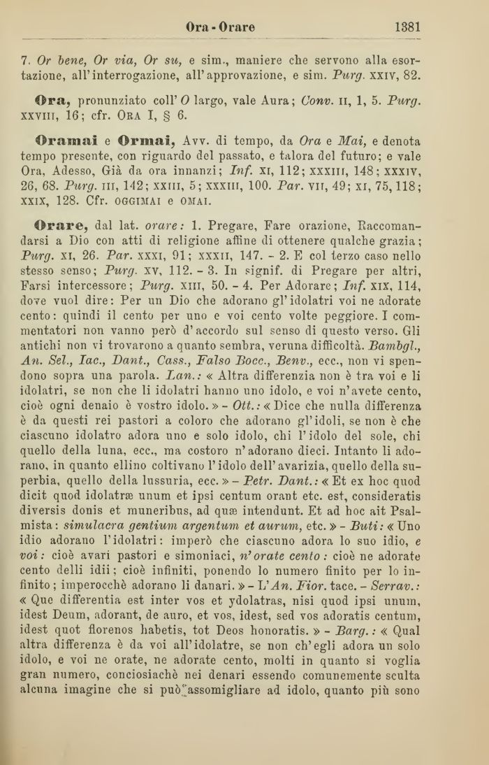 Orare, dal lat. orare: 1. Pregare, Pare orazione, Eaccomandarsi a Dio con atti di religione affine di ottenere qualche grazia ; Purg. xi, 26. Par. xxxi, 91 ; xxxii, 147. - 2. E col terzo caso nello stesso senso; Purg. xv, 112.-3. In signif. di Pregare per altri, Farsi intercessore; Purg. xiii, 50. -4. Per Adorare; Inf. xix, 114, dove vuol dire: Per un Dio che adorano gl'idolatri voi ne adorate cento: quindi il cento per uno e voi cento volte peggiore. I commentatori non vanno però d' accordo sul senso di questo verso. Gli antichi non vi trovarono a quanto sembra, veruna difficoltà. Bambgì., An. Sei., Iac., Dant., Cass., Falso Bocc., Benv., ecc., non vi spendono sopra una parola. Lan.: « Altra differenzia non è tra voi e li idolatri, se non che li idolatri hanno uno idolo, e voi n'avete cento, cioè ogni denaio è vostro idolo.» - Ott.:« Dice che nulla differenza è da questi rei pastori a coloro che adorano gl'idoli, se non è che ciascuno idolatro adora uno e solo idolo, chi l'idolo del sole, chi quello della luna, ecc., ma costoro n'adorano dieci. Intanto li adorano, in quanto ellino coltivano l'idolo dell' avarizia, quello della superbia, quello della lussuria, ecc. » - Petr. Dant.: « Et ex hoc quod dicit quod idolatra unum et ipsi centum orant etc. est, consideratis diversis donis et muneribns, ad quse intendunt. Et ad hoc ait Psal-mista : simulacra gentium argentum et aurum, etc. » - Buti: « Uno idio adorano l'idolatri: imperò che ciascuno adora lo suo idio, e voi: cioè avari pastori e simoniaci, n'orate cento: cioè ne adorate cento delli idii ; cioè infiniti, ponendo lo numero finito per lo infinito ; imperocché adorano li danari. » - V An. Fior. tace. - Serrav.: « Que differentia est inter vos et ydolatras, nisi quod ipsi unum, idest Deum, adorant, de auro, et vos, idest, sed vos adoratis centum, idest quot florenos habetis, tot Deos honoratis. » - Barg. : « Qual altra differenza è da voi all'idolatre, se non ch'egli adora un solo idolo, e voi ne orate, ne adorate cento, molti in quanto si voglia gran numero, conciosiachè nei denari essendo comunemente sculta alcuna imagine che si può.^assomigliare ad idolo, quanto più sono
