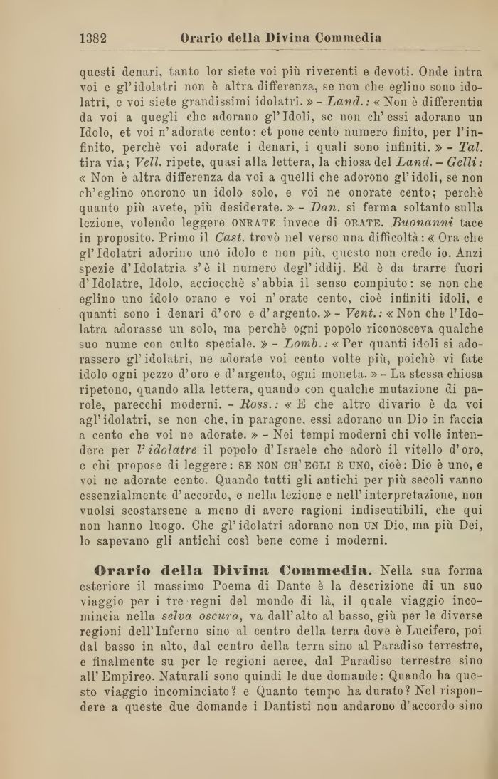 questi denari, tanto lor siete voi più riverenti e devoti. Onde intra voi e gl'idolatri non è altra differenza, se non che eglino sono idolatri, e voi siete grandissimi idolatri. » - Land.: « Non è differentia da voi a quegli che adorano gl'Idoli, se non ch'essi adorano un Idolo, et voi n'adorate cento: et pone cento numero finito, per l'infinito, perchè voi adorate i denari, i quali sono infiniti. » - Tal. tira via; Veli, ripete, quasi alla lettera, la chiosa del T^and.- Gelli: « Non è altra differenza da voi a quelli che adorono gl'idoli, se non ch'eglino onorono un idolo solo, e voi ne onorate cento; perchè quanto più avete, più desiderate. » - Dan. si ferma soltanto sulla lezione, volendo leggere onrate invece di orate. JBuonanni tace in proposito. Primo il Cast, trovò nel verso una difficoltà: « Ora che gl'Idolatri adorino unó idolo e non più, questo non credo io. Anzi spezie d'Idolatria s'è il numero degl'iddij. Ed è da trarre fuori d'Idolatre, Idolo, acciocché s'abbia il senso compiuto: se non che eglino uno idolo orano e voi n'orate cento, cioè infiniti idoli, e quanti sono i denari d'oro e d'argento.»- Fieni.: «Non che l'Idolatra adorasse un solo, ma perchè ogni popolo riconosceva qualche suo nume con culto speciale. » - Lomb. : « Per quanti idoli si adorassero gl'idolatri, ne adorate voi cento volte più, poiché vi fate idolo ogni pezzo d'oro e d' argento, ogni moneta. » - La stessa chiosa ripetono, quando alla lettera, quando con qualche mutazione di parole, parecchi moderni. - Ross. : «E che altro divario è da voi agl'idolatri, se non che, in paragone, essi adorano un Dio in faccia a cento che voi ne adorate. » - Nei tempi moderni chi volle intendere per l'idolatre il popolo d'Israele che adorò il vitello d'oro, e chi propose di leggere: se non ch'egli è uno, cioè: Dio è uno, e voi ne adorate cento. Quando tutti gli antichi per più secoli vanno essenzialmente d'accordo, e nella lezione e nell'interpretazione, non vuoisi scostarsene a meno di avere ragioni indiscutibili, che qui non hanno luogo. Che gl'idolatri adorano non un Dio, ma più Dei, lo sapevano gli antichi così bene come i moderni.