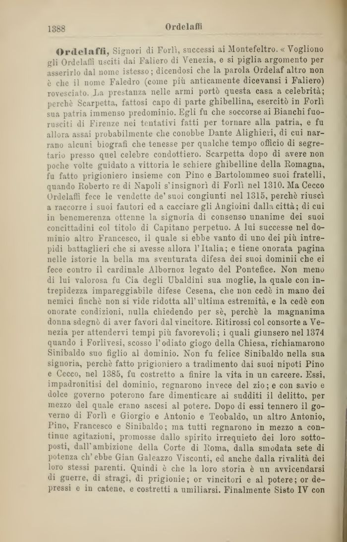 Ordelaffi, Signori di Forlì, successi ai Montefeltro. « Vogliono pli Ordelaffi usciti dai Faliero di Venezia, e si piglia argomento per asserirlo dal nome istesso; dicendosi che la parola Ordelaf altro non è che il nome Faledro (come più anticamente dicevansi i Faliero) rovesciato. La prestanza nelle armi portò questa casa a celebrità; perchè Scarpetta, fattosi capo di parte ghibellina, esercitò in Forlì sua patria immenso predominio. Egli fu che soccorse ai Bianchi fuorusciti di Firenze nei tentativi fatti per tornare alla patria, e fu allora assai probabilmente che conobbe Dante Alighieri, di cui narrano alcuni biografi che tenesse per qualche tempo officio di segretario presso quel celebre condottiero. Scarpetta dopo di avere non poche volte guidato a vittoria le schiere ghibelline della Romagna, fu fatto prigioniero insieme con Pino e Bartolommeo suoi fratelli, quando Roberto re di Napoli s'insignorì di Forlì nel 1310. Ma Cecco Ordelaffi fece le vendette de' suoi congiunti nel 1315, perchè riuscì a raccorre i suoi fautori ed a cacciare gli Angioini dalla città; di cui in benemerenza ottenne la signoria di consenso unanime dei suoi concittadini col titolo di Capitano perpetuo. A lui successe nel dominio altro Francesco, il quale si ebbe vanto di uno dei più intrepidi battaglieri che si avesse allora l'Italia; e tiene onorata pagina nelle istorie la bella ma sventurata difesa dei suoi dominii che ei fece contro il cardinale Albornoz legato del Pontefice. Non meno di lui valorosa fu Cia degli Ubaldini sua moglie, la quale con intrepidezza impareggiabile difese Cesena, che non cedè in mano dei nemici finché non si vide ridotta all'ultima estremità, e la cedè con onorate condizioni, nulla chiedendo per sè, perchè la magnanima donna sdegnò di aver favori dal vincitore. Ritirossi col consorte a Venezia per attendervi tempi più favorevoli; i quali giunsero nel 1374 quando i Forlivesi, scosso l'odiato giogo della Chiesa, richiamarono Sinibaldo suo figlio al dominio. Non fu felice Sinibaldo nella sua signoria, perchè fatto prigioniero a tradimento dai suoi nipoti Pino e Cecco, nel 1385, fu costretto a finire la vita in un carcere. Essi, impadronitisi del dominio, regnarono invece del zio; e con savio e dolce governo poterono fare dimenticare ai sudditi il delitto, per mezzo del quale erano ascesi al potere. Dopo di essi tennero il governo di Forlì e Giorgio e Antonio e Teobaldo, un altro Antonio, Pino, Francesco e Sinibaldo; ma tutti regnarono in mezzo a continue agitazioni, promosse dallo spirito irrequieto dei loro sottoposti, dall'ambizione della Corte di Roma, dalla smodata sete di potenza ch'ebbe Gian Galeazzo Visconti, ed anche dalla rivalità dei loro stessi parenti. Quindi è che la loro storia è un avvicendarsi di guerre, di stragi, di prigionie; or vincitori e al potere; or depressi e in catene, e costretti a umiliarsi. Finalmente Sisto IV con