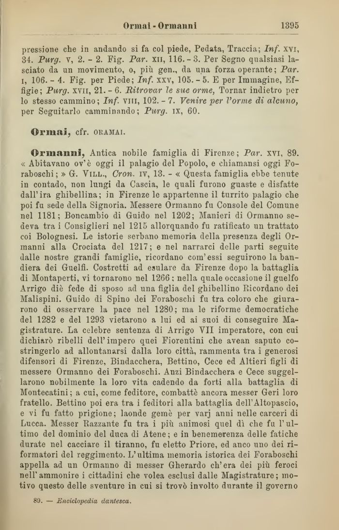 Ormanni, Antica nobile famiglia di Firenze ; Par. xvi, 89. « Abitavano ov'è oggi il palagio del Popolo, e chiamansi oggi Foraboschi ; » G. Vill., Cron. iv, 13. - « Questa famiglia ebbe tenute in contado, non lungi da Cascia, le quali furono guaste e disfatte dall'ira ghibellina; in Firenze le appartenne il turrito palagio che poi fu sede della Signoria. Messere Ormanno fu Console del Comune nel 1181; Boncambio di Guido nel 1202; Manieri di Ormanno sedeva tra i Consiglieri nel 1215 allorquando fu ratificato un trattato coi Bolognesi. Le istorie serbano memoria della presenza degli Ormanni alla Crociata del 1217; e nel narrarci delle parti seguite dalle nostre grandi famiglie, ricordano com'essi seguirono la bandiera dei Guelfi. Costretti ad esulare da Firenze dopo la battaglia di Montaperti, vi tornarono nel 1266 ; nella quale occasione il guelfo Arrigo die fede di sposo ad una figlia del ghibellino Ricordano dei Malispini. Guido di Spino dei Foraboschi fu tra coloro che giurarono di osservare la pace nel 1280; ma le riforme democratiche del 1282 e del 1293 vietarono a lui ed ai suoi di conseguire Magistrature. La celebre sentenza di Arrigo VII imperatore, con cui dichiarò ribelli dell'impero quei Fiorentini che avean saputo costringerlo ad allontanarsi dalla loro città, rammenta tra i generosi difensori di Firenze, Bindacchera, Bettino, Cece ed Altieri figli di messere Ormanno dei Foraboschi. Anzi Bindacchera e Cece suggellarono nobilmente la loro vita cadendo da forti alla battaglia di Montecatini ; a cui, come feditore, combattè ancora messer Geri loro fratello. Bettino poi era tra i feditovi alla battaglia dell'Altopascio, e vi fu fatto prigione; laonde gemè per varj anni nelle carceri di Lucca. Messer Razzante fu tra i più animosi quel dì che fu l'ultimo del dominio del duca di Atene; e in benemerenza delle fatiche durate nel cacciare il tiranno, fu eletto Priore, ed anco uno dei riformatori del reggimento. L'ultima memoria istorica dei Foraboschi appella ad un Ormanno di messer Gherardo ch'era dei più feroci nel!'ammonire i cittadini che volea esclusi dalle Magistrature; motivo questo delle sventure in cui si trovò involto durante il governo
