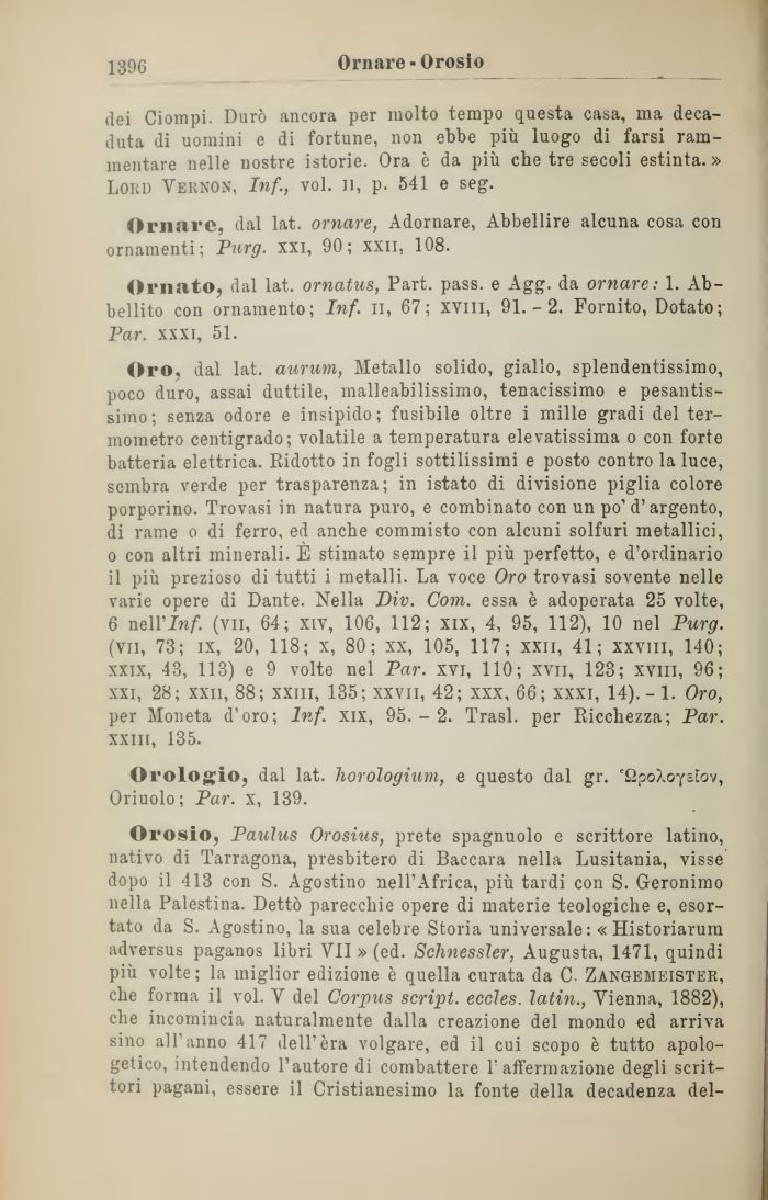 Oro. dal lat. aurum, Metallo solido, giallo, splendentissimo, poco duro, assai duttile, malleabilissimo, tenacissimo e pesantissimo; senza odore e insipido; fusibile oltre i mille gradi del termometro centigrado; volatile a temperatura elevatissima o con forte batteria elettrica. Ridotto in fogli sottilissimi e posto contro la luce, sembra verde per trasparenza; in istato di divisione piglia colore porporino. Trovasi in natura puro, e combinato con un po'd'argento, di rame o di ferro, ed anche commisto con alcuni solfuri metallici, o con altri minerali. È stimato sempre il più perfetto, e d'ordinario il più prezioso di tutti i metalli. La voce Oro trovasi sovente nelle varie opere di Dante. Nella Div. Com. essa è adoperata 25 volte, 6 nell'In/, (vii, 64; xiv, 106, 112; xix, 4, 95, 112), 10 nel Purg. (Vii, 73; ix, 20, 118; x, 80; xx, 105, 117; xxii, 41; xxviii, 140; xxix, 43, 113) e 9 volte nel Par. xvi, 110; xvii, 123; xviii, 96; xxi, 28 ; xxii, 88 ; xxiii, 135 ; xxvii, 42 ; xxx, 66 ; xxxi, 14). - 1. Oro, per Moneta d'oro; Inf. xix, 95.-2. Trasl. per Ricchezza; Par. xxiii, 135.