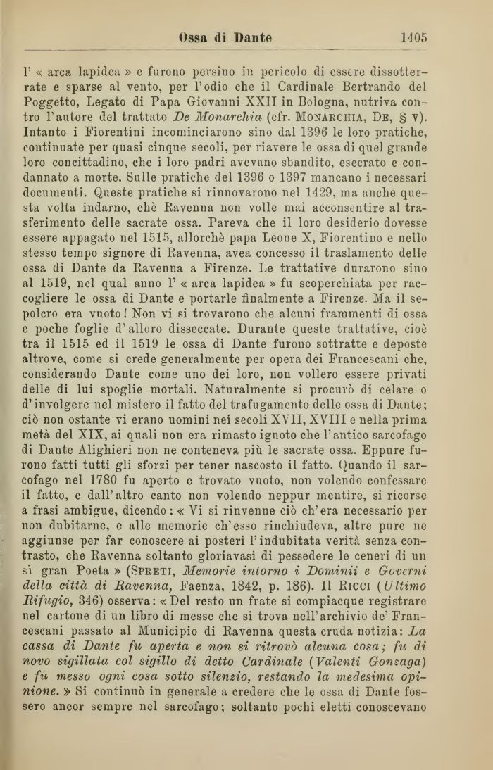 1' « arca lapidea » e furono persino in pericolo di essere dissotterrate e sparse al vento, per l'odio che il Cardinale Bertrando del Poggetto, Legato di Papa Giovanni XXII in Bologna, nutriva contro l'autore del trattato De Monarchia (cfr. Monarchia, De, § v). Intanto i Fiorentini incominciarono sino dal 1396 le loro pratiche, continuate per quasi cinque secoli, per riavere le ossa di quel grande loro concittadino, che i loro padri avevano sbandito, esecrato e condannato a morte. Sulle pratiche del 1396 o 1397 mancano i necessari documenti. Queste pratiche si rinnovarono nel 1429, ma anche questa volta indarno, chè Ravenna non volle mai acconsentire al trasferimento delle sacrate ossa. Pareva che il loro desiderio dovesse essere appagato nel 1515, allorché papa Leone X, Fiorentino e nello stesso tempo signore di Ravenna, avea concesso il traslamento delle ossa di Dante da Ravenna a Firenze. Le trattative durarono sino al 1519, nel qual anno 1' « arca lapidea » fu scoperchiata per raccogliere le ossa di Dante e portarle finalmente a Firenze. Ma il sepolcro era vuoto! Non vi si trovarono che alcuni frammenti di ossa e poche foglie d'alloro disseccate. Durante queste trattative, cioè tra il 1515 ed il 1519 le ossa di Dante furono sottratte e deposte altrove, come si crede generalmente per opera dei Francescani che, considerando Dante come uno dei loro, non vollero essere privati delle di lui spoglie mortali. Naturalmente si procurò di celare o d'involgere nel mistero il fatto del trafugamento delle ossa di Dante; ciò non ostante vi erano uomini nei secoli XVII, XVIII e nella prima metà del XIX, ai quali non era rimasto ignoto che l'antico sarcofago di Dante Alighieri non ne conteneva più le sacrate ossa. Eppure furono fatti tutti gli sforzi per tener nascosto il fatto. Quando il sarcofago nel 1780 fu aperto e trovato vuoto, non volendo confessare il fatto, e dall'altro canto non volendo neppur mentire, si ricorse a frasi ambigue, dicendo: « Vi si rinvenne ciò ch'era necessario per non dubitarne, e alle memorie ch'esso rinchiudeva, altre pure ne aggiunse per far conoscere ai posteri l'indubitata verità senza contrasto, che Ravenna soltanto gloriavasi di pessedere le ceneri di un sì gran Poeta » (Spreti, Memorie intorno i Dominii e Governi della città di Ravenna, Faenza, 1842, p. 186). Il Ricci (Ultimo Rifugio, 346) osserva: «Del resto un frate si compiacque registrare nel cartone di un libro di messe che si trova nell'archivio de' Francescani passato al Municipio di Ravenna questa cruda notizia: La cassa di Dante fu aperta e non si ritrovò alcuna cosa; fu di novo sigillata col sigillo di detto Cardinale (Valenti Gonzaga) e fu messo ogni cosa sotto silenzio, restando la medesima opinione. » Si continuò in generale a credere che le ossa di Dante fossero ancor sempre nel sarcofago; soltanto pochi eletti conoscevano