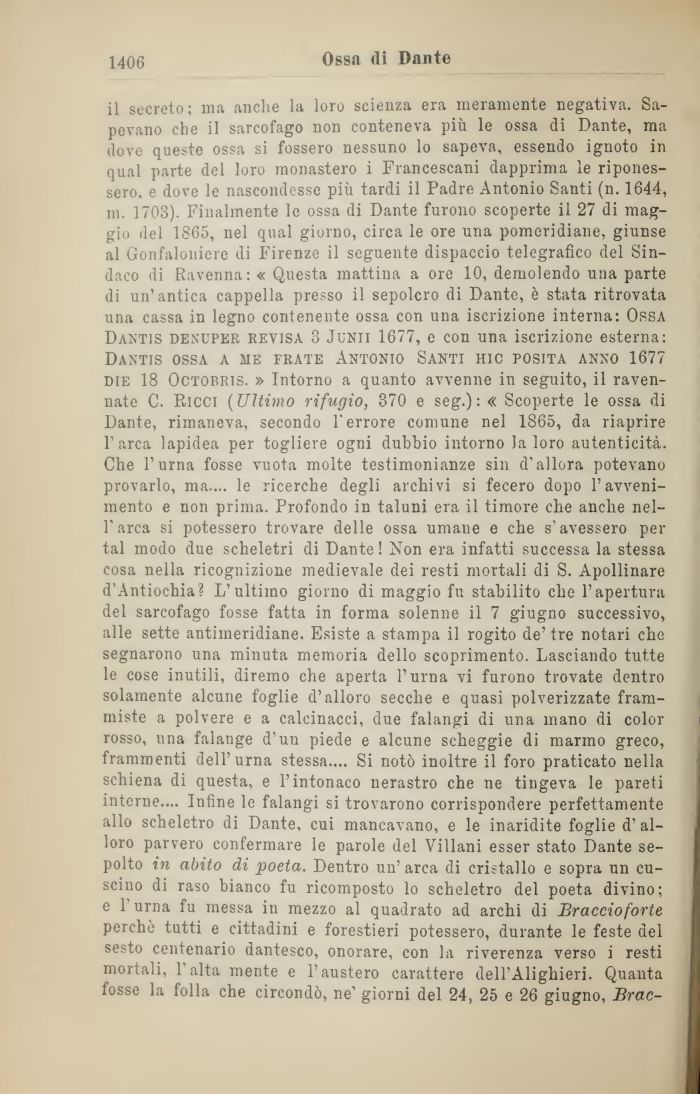 il secreto; ma anche la loro scienza era meramente negativa. Sapevano che il sarcofago non conteneva più le ossa di Dante, ma dove queste ossa si fossero nessuno lo sapeva, essendo ignoto in qual parte del loro monastero i Francescani dapprima le riponessero, e dove le nascondesse più tardi il Padre Antonio Santi (n. 1644, 111. 1703). Finalmente le ossa di Dante furono scoperte il 27 di maggio ilei 1865, nel qual giorno, circa le ore una pomeridiane, giunse al Gonfaloniere di Firenze il seguente dispaccio telegrafico del Sindaco di Ravenna: « Questa mattina a ore 10, demolendo una parte di un'antica cappella presso il sepolcro di Dante, è stata ritrovata una cassa in legno contenente ossa con una iscrizione interna: Orsa Dantis denuper revisa 3 Junii 1677, e con una iscrizione esterna: Daxtis ossa a me frate Antonio Santi hic posita anno 1677 die 18 Octobris. » Intorno a quanto avvenne in seguito, il ravennate C. Ricci (Ultimo rifugio, 370 e seg.): « Scoperte le ossa di Dante, rimaneva, secondo l'errore comune nel 1865, da riaprire l'arca lapidea per togliere ogni dubbio intorno la loro autenticità. Che l'urna fosse vuota molte testimonianze sin d'allora potevano provarlo, ma.... le ricerche degli archivi si fecero dopo l'avvenimento e non prima. Profondo in taluni era il timore che anche nell'arca si potessero trovare delle ossa umane e che s'avessero per tal modo due scheletri di Dante! Non era infatti successa la stessa cosa nella ricognizione medievale dei resti mortali di S. Apollinare d'Antiochia? L'ultimo giorno di maggio fu stabilito che l'apertura del sarcofago fosse fatta in forma solenne il 7 giugno successivo, alle sette antimeridiane. Esiste a stampa il rogito de'tre notari che segnarono una minuta memoria dello scoprimento. Lasciando tutte le cose inutili, diremo che aperta l'urna vi furono trovate dentro solamente alcune foglie d'alloro secche e quasi polverizzate frammiste a polvere e a calcinacci, due falangi di una mano di color rosso, una falange d'un piede e alcune scheggie di marmo greco, frammenti dell'urna stessa.... Si notò inoltre il foro praticato nella schiena di questa, e l'intonaco nerastro che ne tingeva le pareti interne.... Infine le falangi si trovarono corrispondere perfettamente allo scheletro di Dante, cui mancavano, e le inaridite foglie d' alloro parvero confermare le parole del Villani esser stato Dante sepolto in abito di poeta. Dentro un'arca di cristallo e sopra un cuscino di raso bianco fu ricomposto lo scheletro del poeta divino; e l'urna fu messa in mezzo al quadrato ad archi di Braccio forte perchè tutti e cittadini e forestieri potessero, durante le feste del sesto centenario dantesco, onorare, con la riverenza verso i resti mortali, l'alta mente e l'austero carattere dell'Alighieri. Quanta fosse la folla che circondò, ne' giorni del 24, 25 e 26 giugno, Brac-