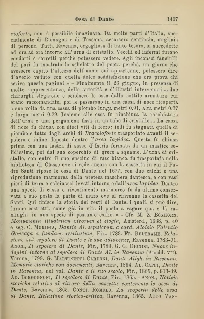 cioforte, non è possibile imaginare. Da molte parti d'Italia, specialmente di Romagna e di Toscana, accorsero centinaia, migliaia di persone. Tutta Ravenna, orgogliosa di tanto tesoro, si succedette ad ora ad ora intorno all'urna di cristallo. Vecchi ed infermi furono condotti e sorretti perchè potessero vedere. Agli inconsci fanciulli del pari fu mostrato lo scheletro del poeta perchè, un giorno che avessero capito l'altezza dell'uomo cui appartenne, potessero dire d'averlo veduto con quella dolce soddisfazione che ora prova chi scrive queste pagine! » - Finalmente il 26 giuguo, in presenza di molte rappresentanze, delle autorità e d'illustri intervenuti.... due chirurghi slegarono e sciolsero le ossa dalla sottile armatura cui erano raccomandate, poi le passarono in una cassa di noce ricoperta a sua volta da una cassa di piombo lunga metri 0.91, alta metri 0.27 e larga metri 0.29. Insieme alle ossa fu rinchiusa la raschiatura dell'urna e una pergamena fìssa in un tubo di cristallo.... La cassa di noce fu chiusa con dieci viti di ferro; indi fu stagnata quella di piombo e tutto dagli archi di Braccio forte, trasportato avanti il sepolcro e infine deposto dentro Varca lapidea. Questa fu chiusa prima con una lastra di sasso d'Istria fermata da un mastice solidissimo, poi dal suo coperchio di greco a squame. L'urna di cristallo, con entro il suo cuscino di raso bianco, fu trasportata nella biblioteca di Classe ove si vede ancora con la cassetta in cui il Padre Santi ripose le ossa di Dante nel 1677, con due calchi e una riproduzione marmorea della pretesa maschera dantesca, e con vasi pieni di terra e calcinacci levati intorno o dall'arca lapidea. Dentro una specie di cassa o rivestimento marmoreo fu da ultimo conservata a suo posto la parte di muro ove si rinvenne la cassetta del Santi. Qui finisce la storia dei resti di Dante, i quali, si può dire, furono costretti, come già in vita il poeta a vagare qua e là raminghi in una specie di postumo esilio. » - Cfr. M. Z. Boxhorn, Monumenta illustrium virorum et elogia, Amsterd., 1638, p. 40 e seg. C. Morigia, Dantis Al. sepulcrum a card. Aloisio Valentio Gonzaga a fundam. restitutum, Fir., 1783. Fr. Beltrame, Relazione stol sepolcro di Dante e le sue adiacenze, Ravenna, 1783-91. Anon., Il sepolcro di Dante, Fir., 1783. G. G. Dionisi, Nuove indagini intorno al sepolcro di Dante Al. in Ravenna (Anedd. vii), Verona, 1799. G. Maetinetti-Cardoni, Dante Aligli, in Ravenna. Memorie storiche con documenti, Ravenna, 1864. Al. Cappi, Dante in Ravenna, nel voi. Dante e il suo secolo, Fir., 1865, p. 813-39. Ad. Borgognoni, Il sepolcro di Dante, Fir., 1865.-Anon., Notizie storiche relative al ritrovo della cassetta contenente le ossa di Dante, Ravenna, 1865. Conti, Romolo, La scoperta delle ossa di Dante. Relazione storico-critica, Ravenna, 1865. Atto Van-