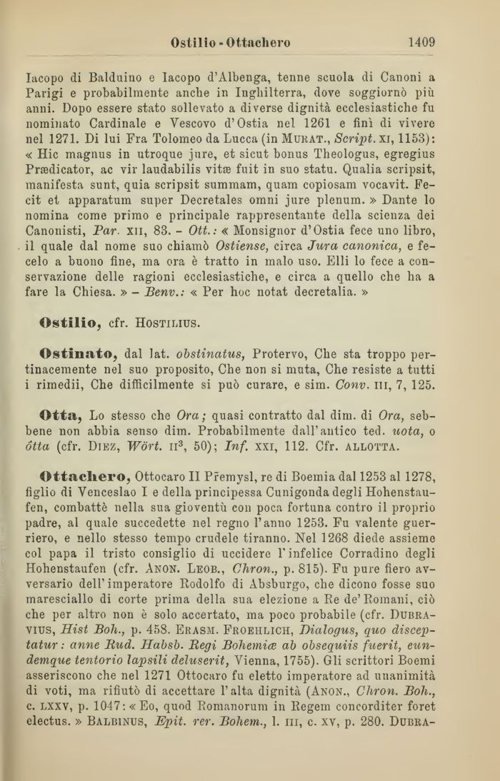 Iacopo di Balduino e Iacopo d'Albenga, tenne scuola di Canoni a Parigi e probabilmente anche in Inghilterra, dove soggiornò più anni. Dopo essere stato sollevato a diverse dignità ecclesiastiche fu nominato Cardinale e Vescovo d'Ostia nel 1261 e finì di vivere nel 1271. Di lui Fra Tolomeo da Lucca (in Murat., Script, xi, 1153): « Hic magnus in utroque jure, et sicut bonus Theologus, egregius Prasdicator, ac vir laudabilis vitse fuit in suo statu. Qualia scripsit, manifesta sunt, quia scripsit summam, quam copiosam vocavit. Fecit et apparatum super Decretales omni jure plenum. » Dante lo nomina come primo e principale rappresentante della scienza dei Canonisti, Par. xii, 83. - Ott.: « Monsignor d'Ostia fece uno libro, il quale dal nome suo chiamò Ostiense, circa Jura canonica, e fe-celo a buono fine, ma ora è tratto in malo uso. Elli lo fece a conservazione delle ragioni ecclesiastiche, e circa a quello che ha a fare la Chiesa. » - Benv.: « Per hoc notat decretalia. »