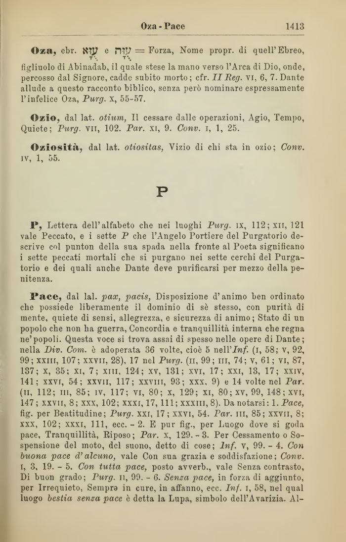 Pace, dal lai. -pax, pacis, Disposizione d' animo ben ordinato che possiede liberamente il dominio di sè stesso, con purità di mente, quiete di sensi, allegrezza, e sicurezza di animo; Stato di un popolo che non ha guerra, Concordia e tranquillità interna che regna ne'popoli. Questa voce si trova assai di spesso nelle opere di Dante; nella Div. Com. è adoperata 36 volte, cioè 5 neWInf. (i, 58; v, 92, 99; xxill, 107; xxvii, 28), 17 nel Purg. (n, 99; in, 74; v, 61; vi, 87, 137; x, 35; xi, 7; xni, 124; xv, 131; xvi, 17; xxi, 13, 17; xxiv, 141; xxvi, 54; xxvii, 117; xxvht, 93; xxx, 9) e 14 volte nel Par. (il, 112; in, 85; iv, 117; vi, 80; x, 129; xi, 80; xv, 99, 148; xvi, 147 ; xxvn, 8; xxx, 102; xxxi, 17, 111; xxxiii, 8). Da notarsi: 1. Pace, fig. per Beatitudine; Purg. xxi, 17; xxvi, 54. Par. in, 85; xxvii, 8; xxx, 102; xxxi, 111, ecc. - 2. E pur fig., per Luogo dove si goda pace, Tranquillità, Riposo; Par. x, 129.-3. Per Cessamento o Sospensione del moto, del suono, detto di cose; Inf. v, 99.- 4. Con buona pace d'alcuno, vale Con sua grazia e soddisfazione; Conv. i, 3, 19. - 5. Con tutta pace, posto avverb., vale Senza contrasto, Di buon grado; Purg. n, 99. - 6. Senza pace, in forza di aggiunto, per Irrequieto, Sempra in cure, in affanno, ecc. Inf. i, 58, nel qual luogo bestia senza pace è detta la Lupa, simbolo dell'Avarizia. Al-