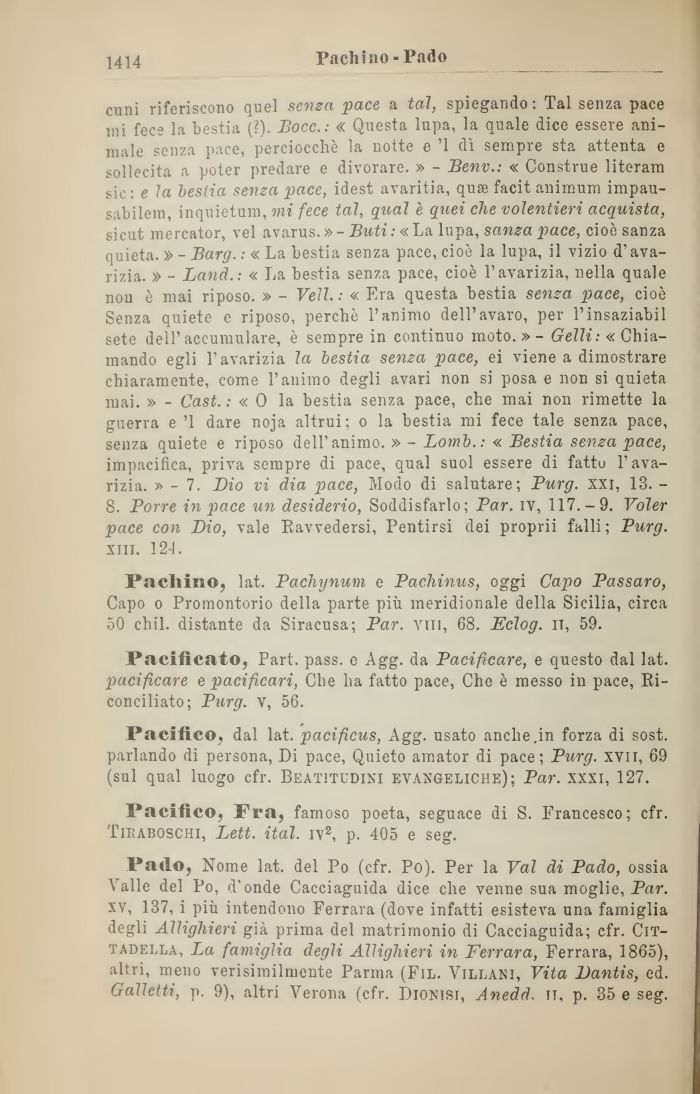 culli riferiscono quel senza pace a tal, spiegando : Tal senza pace ini fece la bestia (?). Bocc.: « Questa lupa, la quale dice essere animale senza pace, perciocché la notte e '1 dì sempre sta attenta e sollecita a poter predare e divorare. » - Benv.: « Construe literam sic: e la bestia senza pace, idest avaritia, qua facit animum impau-sabilem, inquietum, mi fece tal, qual e quei che volentieri acquista, sicut mercator, vel avarus.»- Buti: «La. lupa, sanza pace, cioè sanza quieta. » - Barg. : « La bestia senza pace, cioè la lupa, il vizio d'avarizia. » - Land.: « La bestia senza pace, cioè l'avarizia, nella quale nou è mai riposo. » - Veli. : « Era questa bestia senza pace, cioè Senza quiete e riposo, perchè l'animo dell'avaro, per l'insaziabil sete dell'accumulare, è sempre in continuo moto.» - Gelli: « Chiamando egli l'avarizia la bestia senza pace, ei viene a dimostrare chiaramente, come l'animo degli avari non si posa e non si quieta mai. » - Cast. : « 0 la bestia senza pace, che mai non rimette la guerra e '1 dare noja altrui; o la bestia mi fece tale senza pace, senza quiete e riposo dell'animo. » - Lomb.: « Bestia senza pace, impacifica, priva sempre di pace, qual suol essere di fatto l'avarizia. » - 7. Lio vi dia pace, Modo di salutare; Purg. xxi, 13. -8. Porre in pace un desiderio, Soddisfarlo; Par. iv, 117.-9. Voler pace con Dio, vale Ravvedersi, Pentirsi dei proprii falli; Purg. xiii. 12-1.