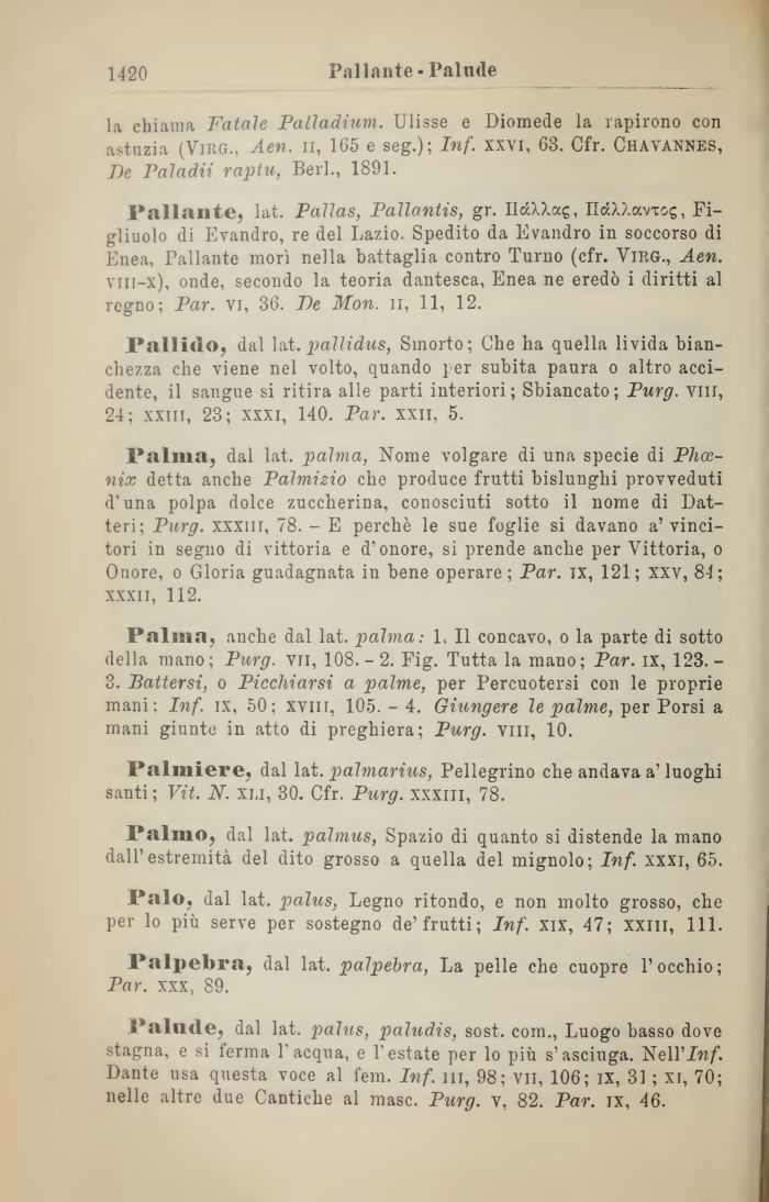 Palnde, dal lat. palus, paludis, sost. com., Luogo basso dove stagna, e si ferma l'acqua, e l'estate per lo più s'asciuga. Nell'Iwf. Dante usa questa voce al fem. Inf. in, 98; Vii, 106; ix, 31 ; xi, 70; nelle altre due Cantiche al masc. Purg. v, 82. Par. ix, 46.