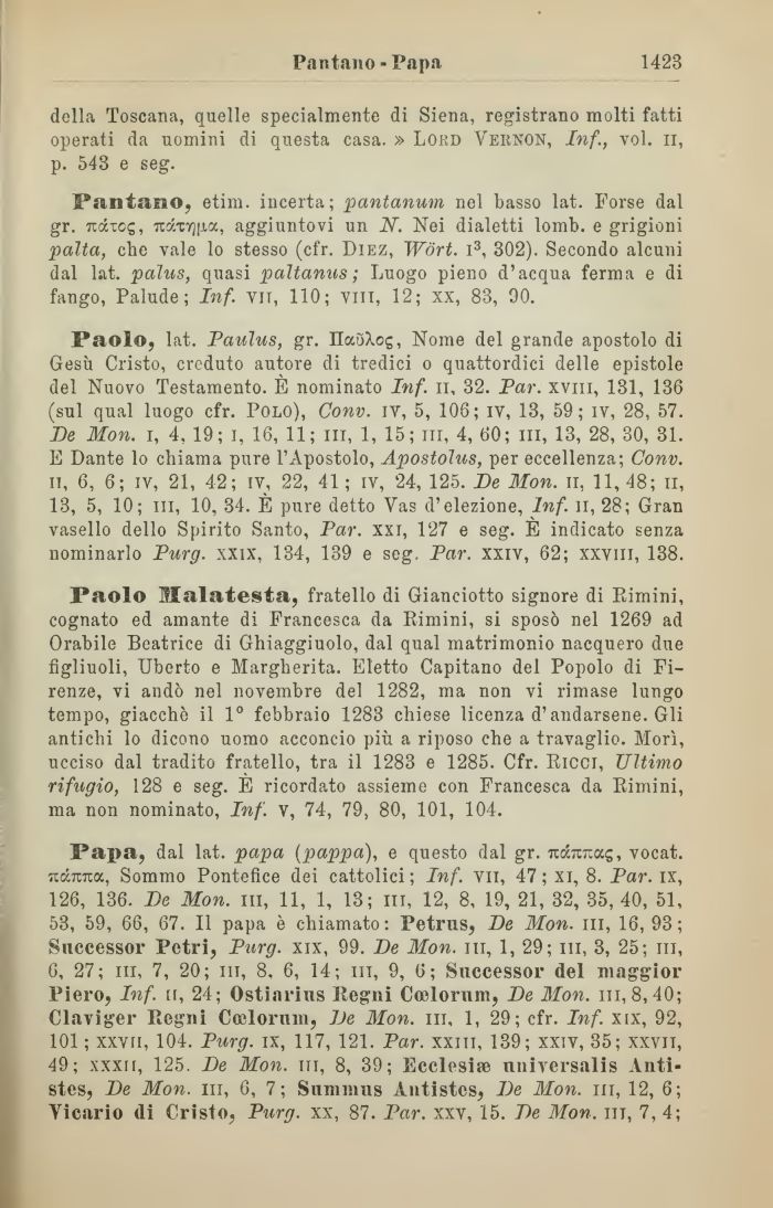 Papa, dal lat. papa (pappa), e questo dal gr. uartriag, vocat. itcOTuoc, Sommo Pontefice dei cattolici ; Inf. vii, 47 ; xi, 8. Par. ix, 126, 136. De Mon. ili, 11, 1, 13; iii, 12, 8, 19, 21, 32, 35, 40, 51, 53, 59, 66, 67. Il papa è chiamato: Petrus, De Mon. in, 16, 93; Suecessor Petri, Purg. xix, 99. Pe Mon. in, 1, 29; ni, 3, 25; in, 6, 27; in, 7, 20; ni, 8, 6, 14; in, 9, 6; Successor del maggior Piero, Inf. ti, 24; Ostiarius Regni Coelorum, Pe Mon. ni, 8, 40; Claviger Regni Coelorum, De Mon. ni, 1, 29; cfr. Inf. xix, 92, 101 ; xxvri, 104. Purg. ix, 117, 121. Par. xxiii, 139; xxiv, 35; xxvii, 49; xxxn, 125. Pe Mon. in, 8, 39; Ecclesiae universalis Anti-stes, Pe Mon. in, 6, 7; Sunnnus Antistes, Pe Mon. in, 12, 6; Vicario di Cristo, Purg. xx, 87. Par. xxv, 15. De Mon. ut, 7, 4;
